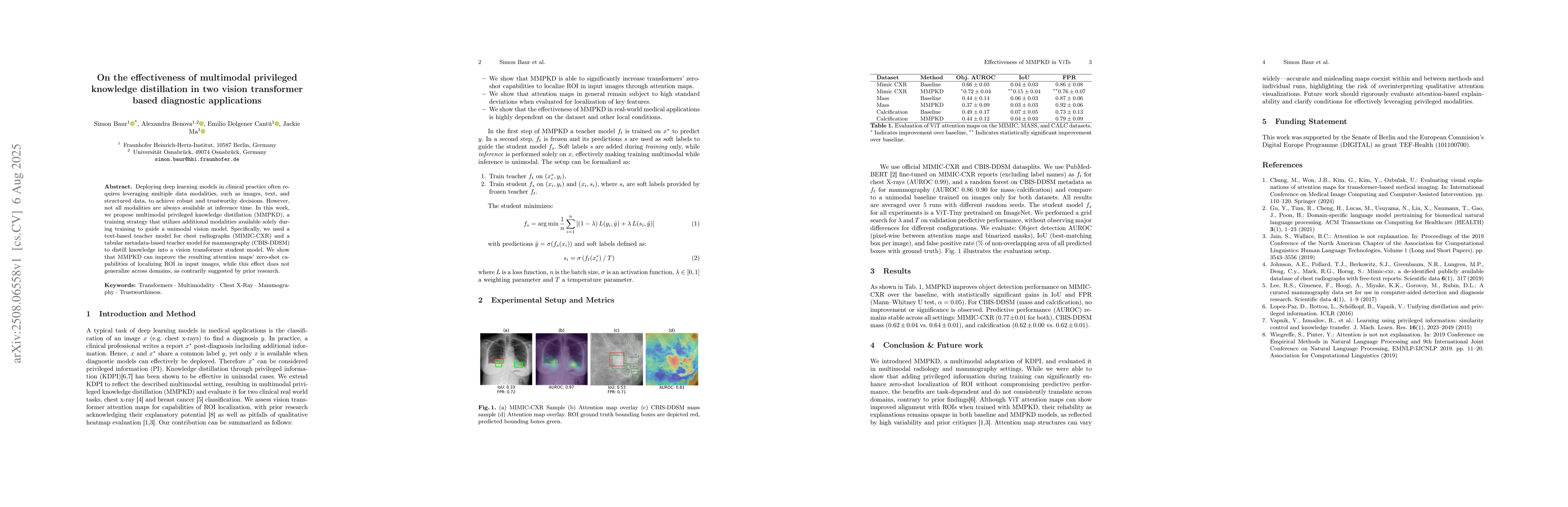 Deploying deep learning models in clinical practice often requires leveraging multiple data modalities, such as images, text, and structured data, to achieve robust and trustworthy decisions. However, not all modalities are always available at inference time. In this work, we propose multimodal privileged knowledge distillation (MMPKD), a training strategy that utilizes additional modalities available solely during training to guide a unimodal vision model. Specifically, we used a text-based teacher model for chest radiographs (MIMIC-CXR) and a tabular metadata-based teacher model for mammography (CBIS-DDSM) to distill knowledge into a vision transformer student model. We show that MMPKD can improve the resulting attention maps' zero-shot capabilities of localizing ROI in input images, while this effect does not generalize across domains, as contrarily suggested by prior research.
