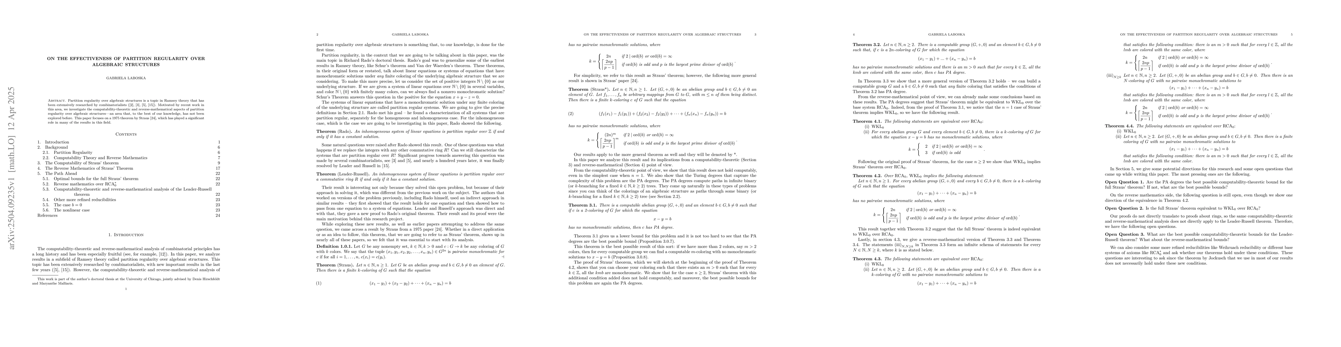 Researchers investigate partition regularity over algebraic structures, exploring its computability-theoretic and reverse-mathematical aspects, building on a 1975 theorem by Straus.