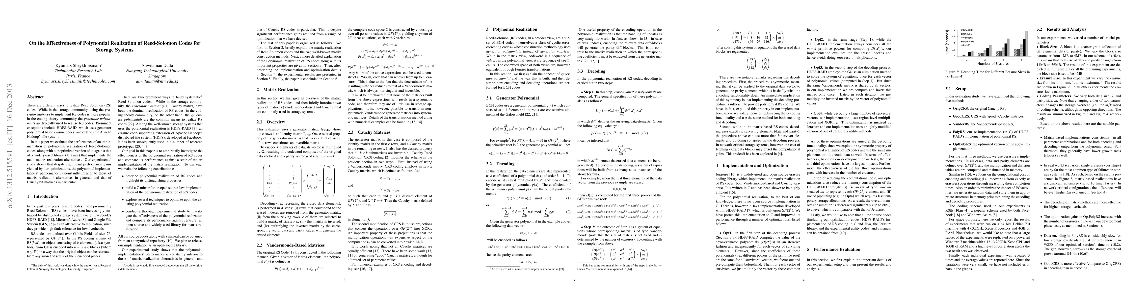This paper evaluates the performance of polynomial realizations of Reed-Solomon codes, comparing it to matrix realizations implemented in Jerasure. Despite optimizations, the polynomial approach consistently underperforms compared to matrix-based methods, especially Cauchy bit matrices.