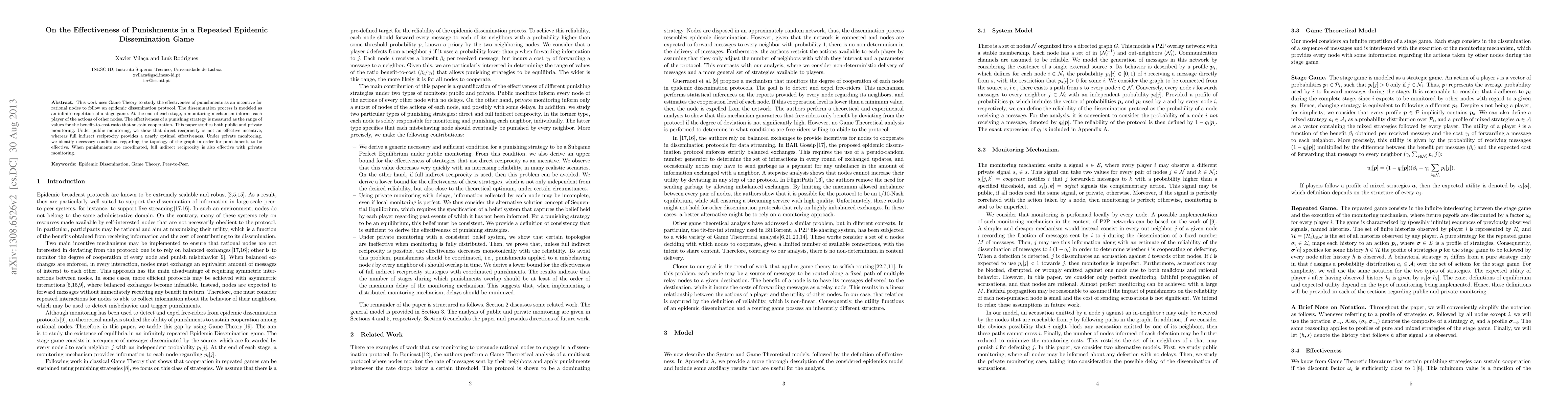 This work uses Game Theory to study the effectiveness of punishments as an incentive for rational nodes to follow an epidemic dissemination protocol. The dissemination process is modeled as an infinite repetition of a stage game. At the end of each stage, a monitoring mechanism informs each player of the actions of other nodes. The effectiveness of a punishing strategy is measured as the range of values for the benefit-to-cost ratio that sustain cooperation. This paper studies both public and private monitoring. Under public monitoring, we show that direct reciprocity is not an effective incentive, whereas full indirect reciprocity provides a nearly optimal effectiveness. Under private monitoring, we identify necessary conditions regarding the topology of the graph in order for punishments to be effective. When punishments are coordinated, full indirect reciprocity is also effective with private monitoring.