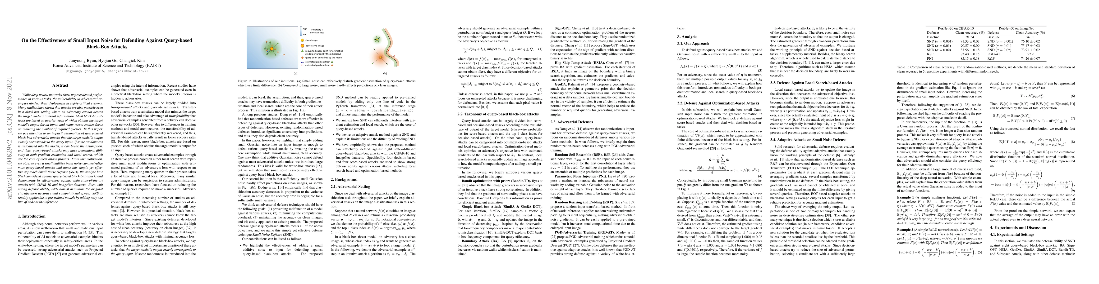 This paper proposes Small Noise Defense (SND) to defend against query-based black-box attacks on deep neural networks by introducing a small amount of input noise, which disrupts the attack's assumption of exact input-output correspondence. SND effectively neutralizes various attacks while maintaining original classification accuracy and computational speed.
