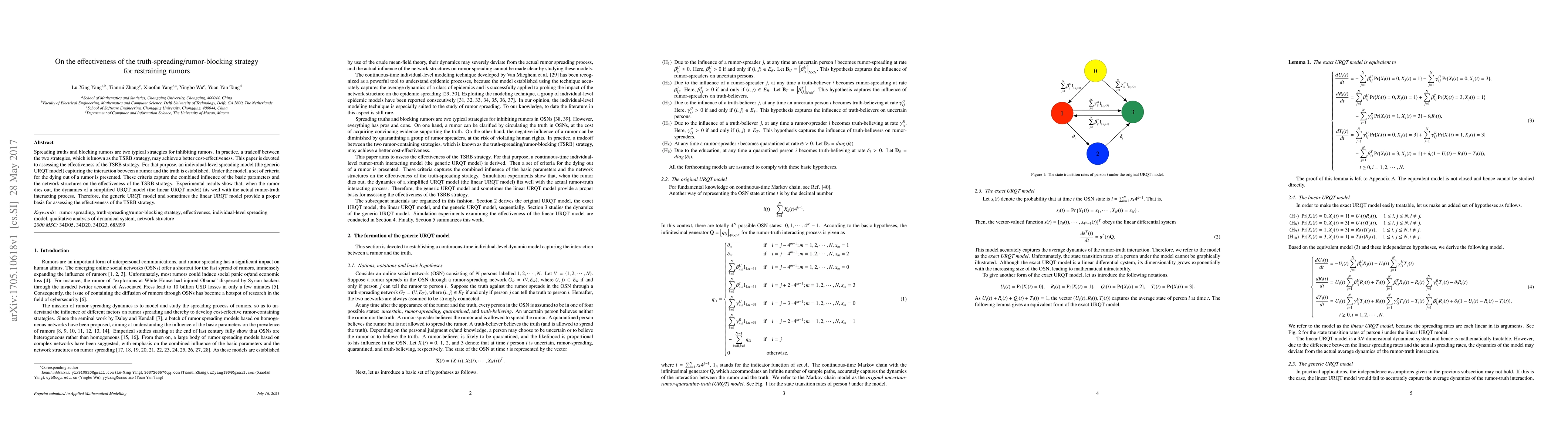 Spreading truths and blocking rumors are two typical strategies for inhibiting rumors. In practice, a tradeoff between the two strategies, which is known as the TSRB strategy, may achieve a better cost-effectiveness. This paper is devoted to assessing the effectiveness of the TSRB strategy. For that purpose, an individual-level spreading model (the generic URQT model) capturing the interaction between a rumor and the truth is established. Under the model, a set of criteria for the dying out of a rumor is presented. These criteria capture the combined influence of the basic parameters and the network structures on the effectiveness of the TSRB strategy. Experimental results show that, when the rumor dies out, the dynamics of a simplified URQT model (the linear URQT model) fits well with the actual rumor-truth interacting process. Therefore, the generic URQT model and sometimes the linear URQT model provide a proper basis for assessing the effectiveness of the TSRB strategy.