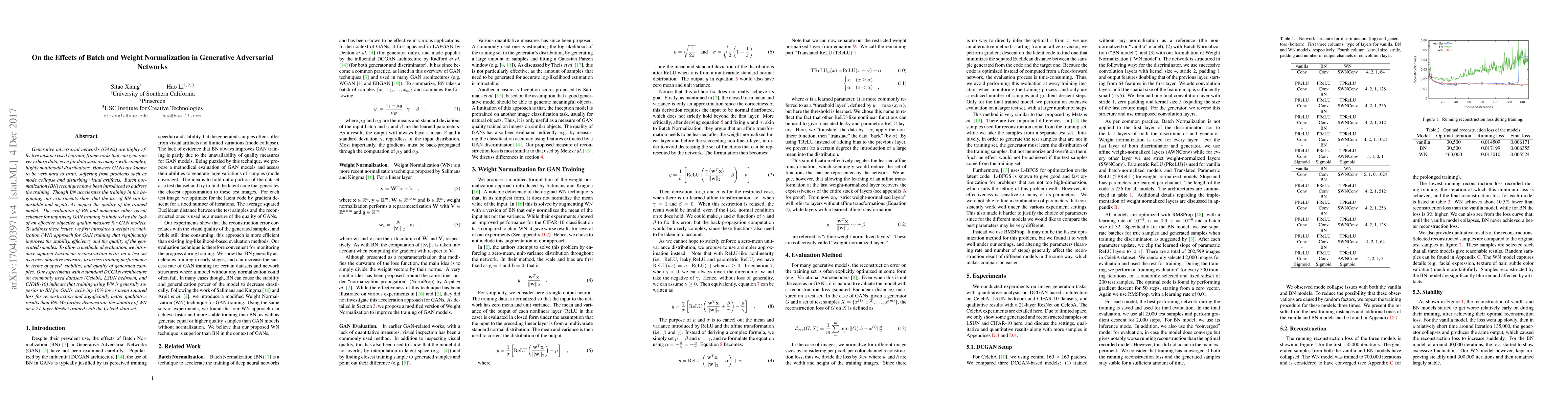 Generative adversarial networks (GANs) are highly effective unsupervised learning frameworks that can generate very sharp data, even for data such as images with complex, highly multimodal distributions. However GANs are known to be very hard to train, suffering from problems such as mode collapse and disturbing visual artifacts. Batch normalization (BN) techniques have been introduced to address the training. Though BN accelerates the training in the beginning, our experiments show that the use of BN can be unstable and negatively impact the quality of the trained model. The evaluation of BN and numerous other recent schemes for improving GAN training is hindered by the lack of an effective objective quality measure for GAN models. To address these issues, we first introduce a weight normalization (WN) approach for GAN training that significantly improves the stability, efficiency and the quality of the generated samples. To allow a methodical evaluation, we introduce squared Euclidean reconstruction error on a test set as a new objective measure, to assess training performance in terms of speed, stability, and quality of generated samples. Our experiments with a standard DCGAN architecture on commonly used datasets (CelebA, LSUN bedroom, and CIFAR-10) indicate that training using WN is generally superior to BN for GANs, achieving 10% lower mean squared loss for reconstruction and significantly better qualitative results than BN. We further demonstrate the stability of WN on a 21-layer ResNet trained with the CelebA data set. The code for this paper is available at https://github.com/stormraiser/gan-weightnorm-resnet