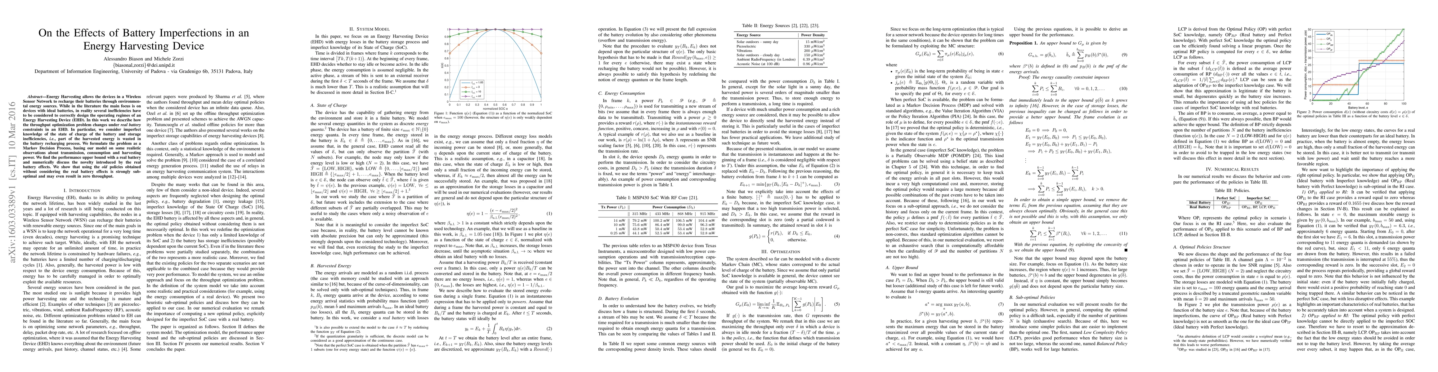 Energy Harvesting allows the devices in a Wireless Sensor Network to recharge their batteries through environmental energy sources. While in the literature the main focus is on devices with ideal batteries, in reality several inefficiencies have to be considered to correctly design the operating regimes of an Energy Harvesting Device (EHD). In this work we describe how the throughput optimization problem changes under \emph{real battery} constraints in an EHD. In particular, we consider imperfect knowledge of the state of charge of the battery and storage inefficiencies, \emph{i.e.}, part of the harvested energy is wasted in the battery recharging process. We formulate the problem as a Markov Decision Process, basing our model on some realistic observations about transmission, consumption and harvesting power. We find the performance upper bound with a real battery and numerically discuss the novelty introduced by the real battery effects. We show that using the \emph{old} policies obtained without considering the real battery effects is strongly sub-optimal and may even result in zero throughput.