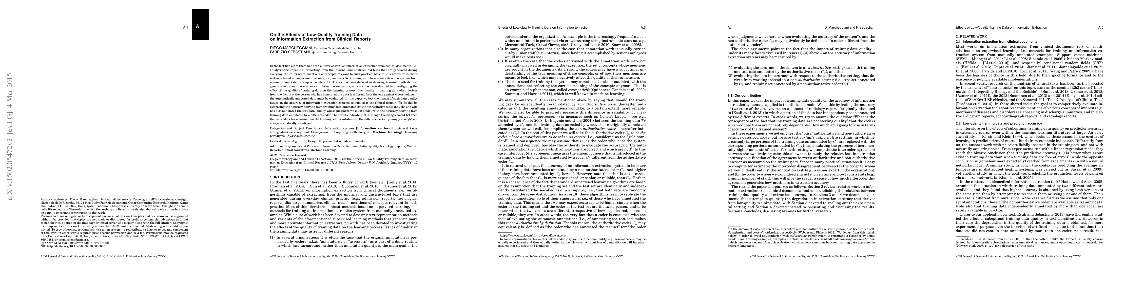 In the last five years there has been a flurry of work on information extraction from clinical documents, i.e., on algorithms capable of extracting, from the informal and unstructured texts that are generated during everyday clinical practice, mentions of concepts relevant to such practice. Most of this literature is about methods based on supervised learning, i.e., methods for training an information extraction system from manually annotated examples. While a lot of work has been devoted to devising learning methods that generate more and more accurate information extractors, no work has been devoted to investigating the effect of the quality of training data on the learning process. Low quality in training data often derives from the fact that the person who has annotated the data is different from the one against whose judgment the automatically annotated data must be evaluated. In this paper we test the impact of such data quality issues on the accuracy of information extraction systems as applied to the clinical domain. We do this by comparing the accuracy deriving from training data annotated by the authoritative coder (i.e., the one who has also annotated the test data, and by whose judgment we must abide), with the accuracy deriving from training data annotated by a different coder. The results indicate that, although the disagreement between the two coders (as measured on the training set) is substantial, the difference is (surprisingly enough) not always statistically significant.