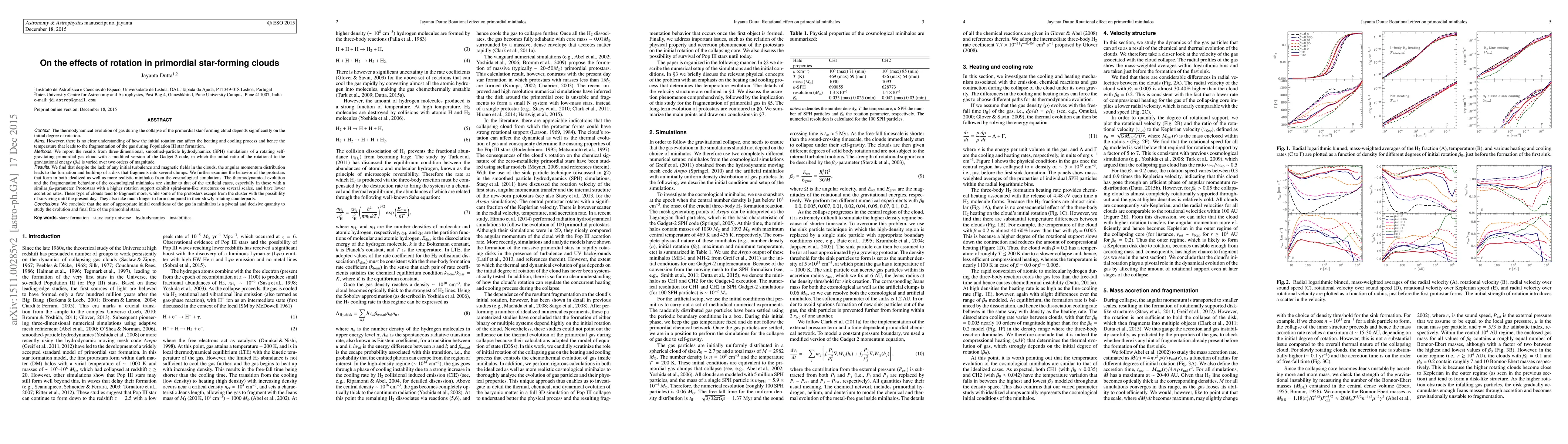 This paper investigates the impact of initial rotation on the thermodynamic evolution and fragmentation of primordial star-forming clouds using 3D SPH simulations. It finds that higher initial rotational energy leads to disk formation, more fragmentation, and lower accretion rates in protostars, while also prolonging their formation time.