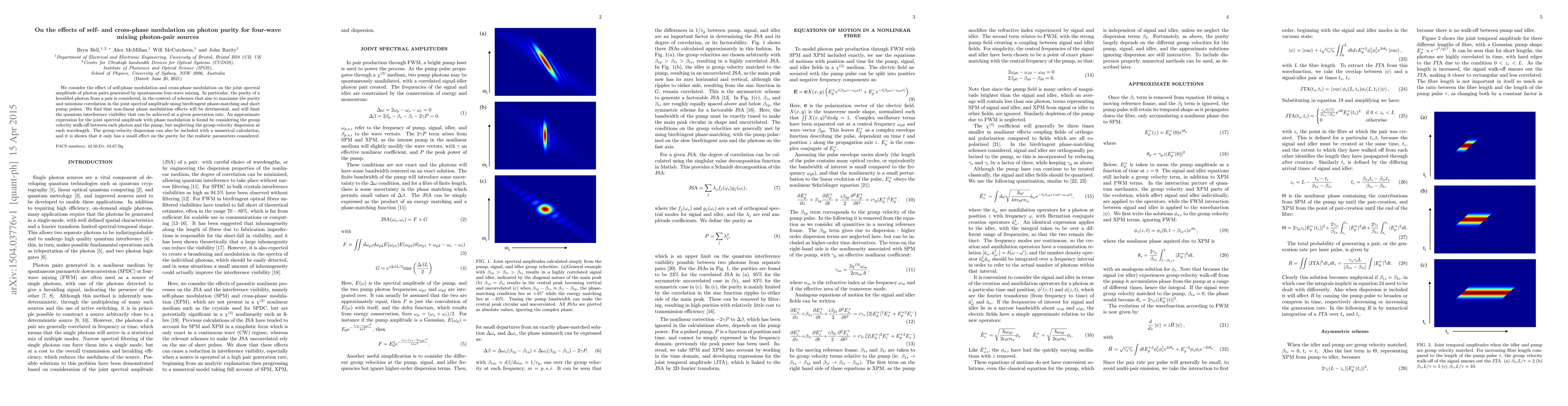 This paper investigates how self- and cross-phase modulation impact the purity of photon pairs generated via spontaneous four-wave mixing, finding that these effects limit quantum interference visibility and purity. The study proposes an approximate model for the joint spectral amplitude, showing that group-velocity dispersion has a minor effect on purity under realistic conditions.
