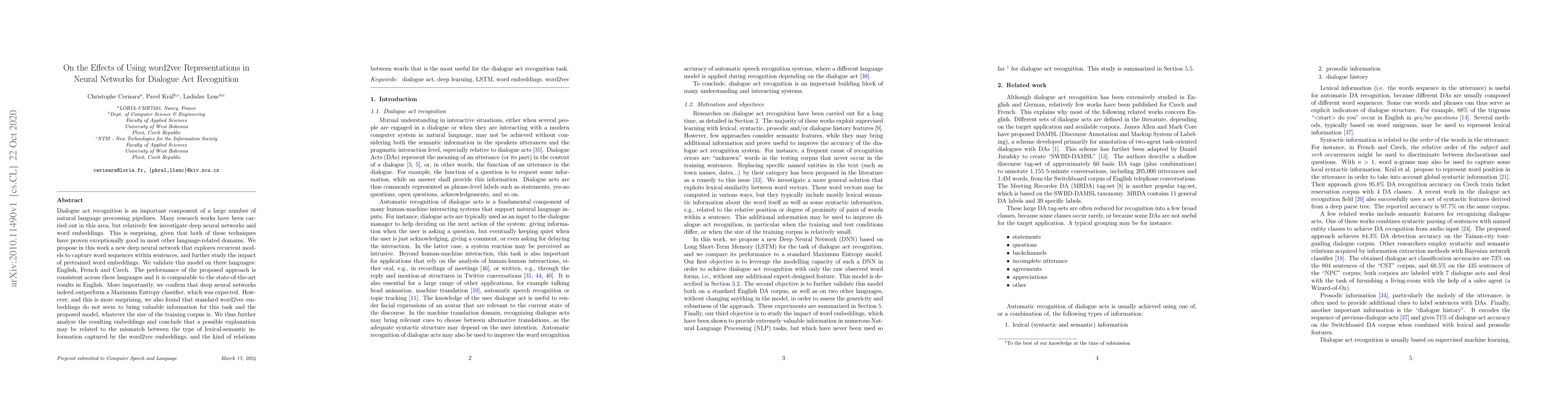 Dialogue act recognition is an important component of a large number of natural language processing pipelines. Many research works have been carried out in this area, but relatively few investigate deep neural networks and word embeddings. This is surprising, given that both of these techniques have proven exceptionally good in most other language-related domains. We propose in this work a new deep neural network that explores recurrent models to capture word sequences within sentences, and further study the impact of pretrained word embeddings. We validate this model on three languages: English, French and Czech. The performance of the proposed approach is consistent across these languages and it is comparable to the state-of-the-art results in English. More importantly, we confirm that deep neural networks indeed outperform a Maximum Entropy classifier, which was expected. However , and this is more surprising, we also found that standard word2vec em-beddings do not seem to bring valuable information for this task and the proposed model, whatever the size of the training corpus is. We thus further analyse the resulting embeddings and conclude that a possible explanation may be related to the mismatch between the type of lexical-semantic information captured by the word2vec embeddings, and the kind of relations between words that is the most useful for the dialogue act recognition task.