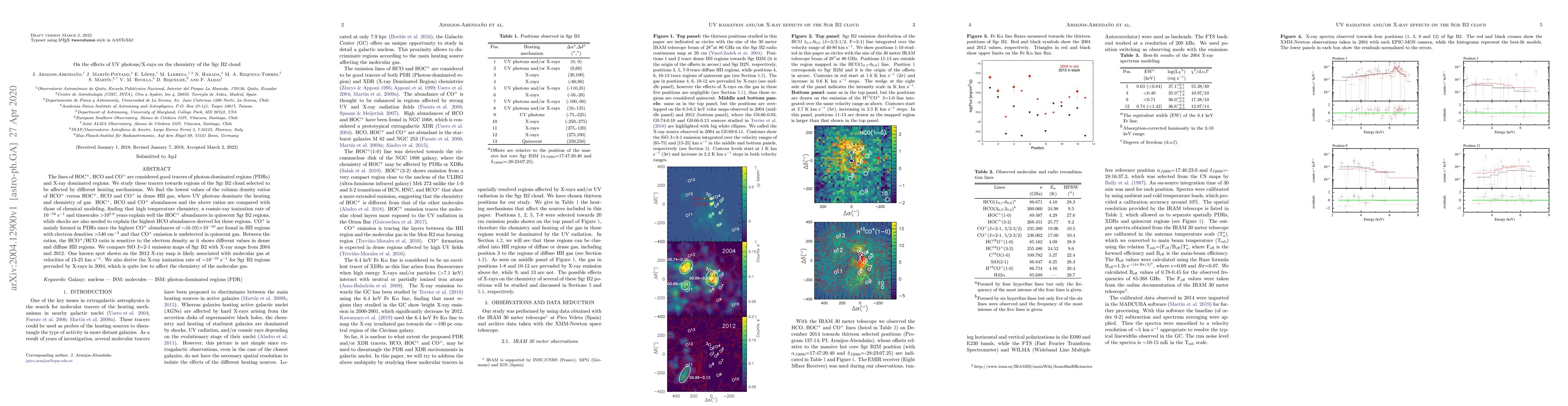 The lines of HOC$^+$, HCO and CO$^+$ are considered good tracers of photon-dominated regions (PDRs) and X-ray dominated regions. We study these tracers towards regions of the Sgr B2 cloud selected to be affected by different heating mechanisms. We find the lowest values of the column density ratios of HCO$^+$ versus HOC$^+$, HCO and CO$^+$ in dense HII gas, where UV photons dominate the heating and chemistry of gas. HOC$^+$, HCO and CO$^+$ abundances and the above ratios are compared with those of chemical modeling, finding that high temperature chemistry, a cosmic-ray ionization rate of 10$^{-16}$ s$^{-1}$ and timescales $>$10$^{5.0}$ years explain well the HOC$^+$ abundances in quiescent Sgr B2 regions, while shocks are also needed to explain the highest HCO abundances derived for these regions. CO$^+$ is mainly formed in PDRs since the highest CO$^+$ abundances of $\sim$(6-10)$\times$10$^{-10}$ are found in HII regions with electron densities $>$540 cm$^{-3}$ and that CO$^+$ emission is undetected in quiescent gas. Between the ratios, the HCO$^+$/HCO ratio is sensitive to the electron density as it shows different values in dense and diffuse HII regions. We compare SiO J=2-1 emission maps of Sgr B2 with X-ray maps from 2004 and 2012. One known spot shown on the 2012 X-ray map is likely associated with molecular gas at velocities of 15-25 km s$^{-1}$. We also derive the X-ray ionization rate of $\sim$10$^{-19}$ s$^{-1}$ for Sgr B2 regions pervaded by X-rays in 2004, which is quite low to affect the chemistry of the molecular gas.