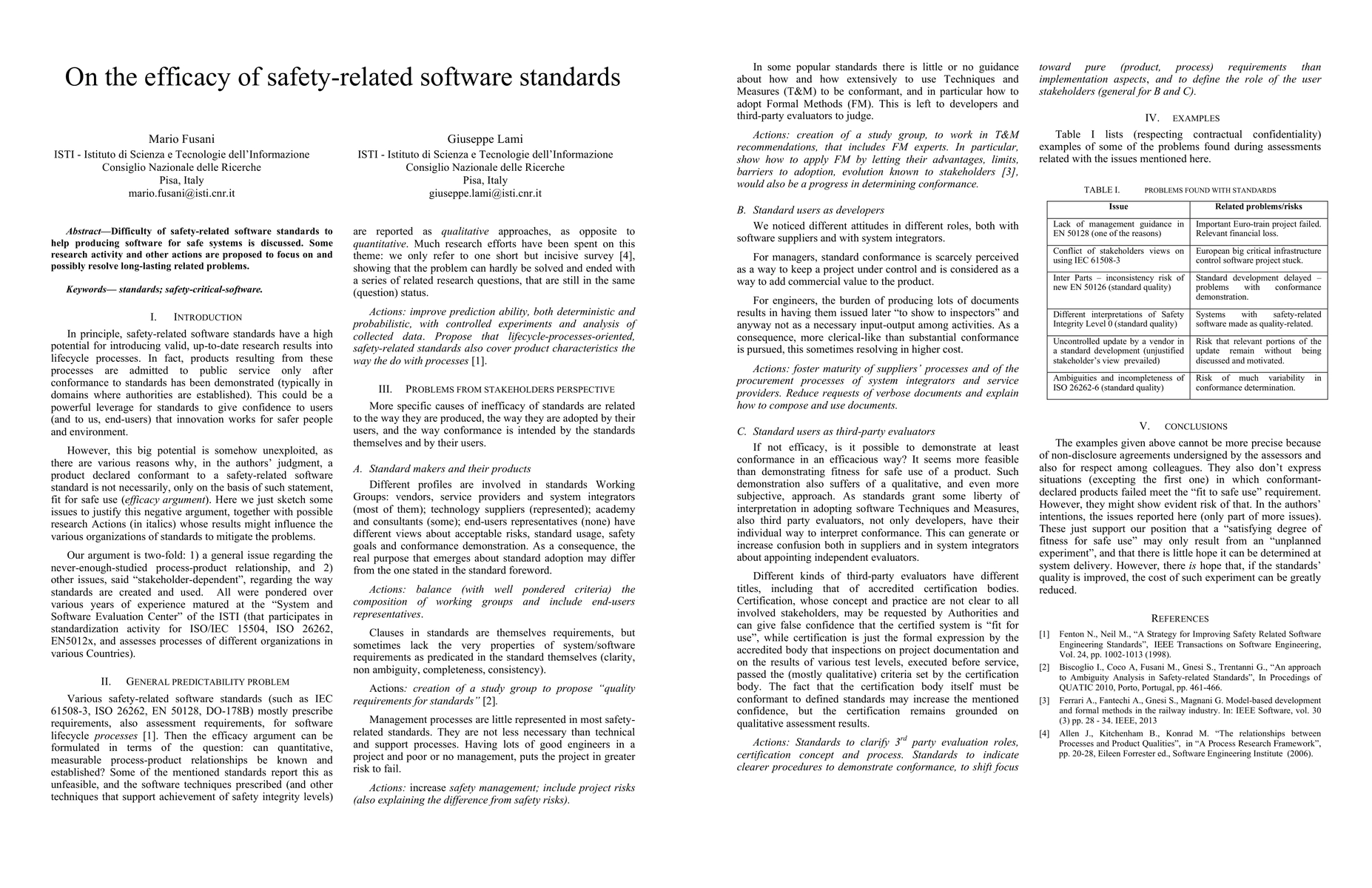 Difficulty of safety-related software standards to help producing software for safe systems is discussed. Some research activity and other actions are proposed to focus on and possibly resolve long-lasting related problems.
