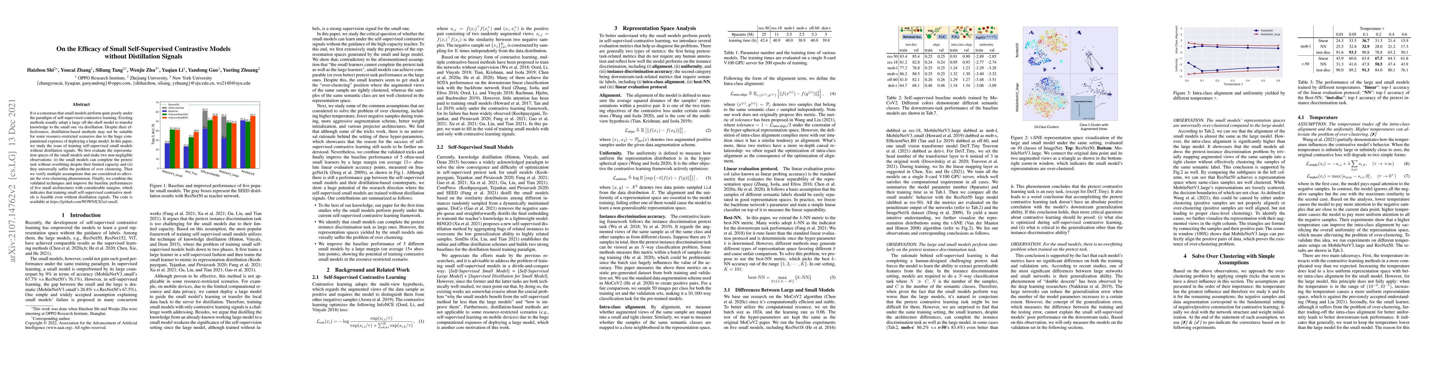 It is a consensus that small models perform quite poorly under the paradigm of self-supervised contrastive learning. Existing methods usually adopt a large off-the-shelf model to transfer knowledge to the small one via distillation. Despite their effectiveness, distillation-based methods may not be suitable for some resource-restricted scenarios due to the huge computational expenses of deploying a large model. In this paper, we study the issue of training self-supervised small models without distillation signals. We first evaluate the representation spaces of the small models and make two non-negligible observations: (i) the small models can complete the pretext task without overfitting despite their limited capacity and (ii) they universally suffer the problem of over clustering. Then we verify multiple assumptions that are considered to alleviate the over-clustering phenomenon. Finally, we combine the validated techniques and improve the baseline performances of five small architectures with considerable margins, which indicates that training small self-supervised contrastive models is feasible even without distillation signals. The code is available at \textit{https://github.com/WOWNICE/ssl-small}.