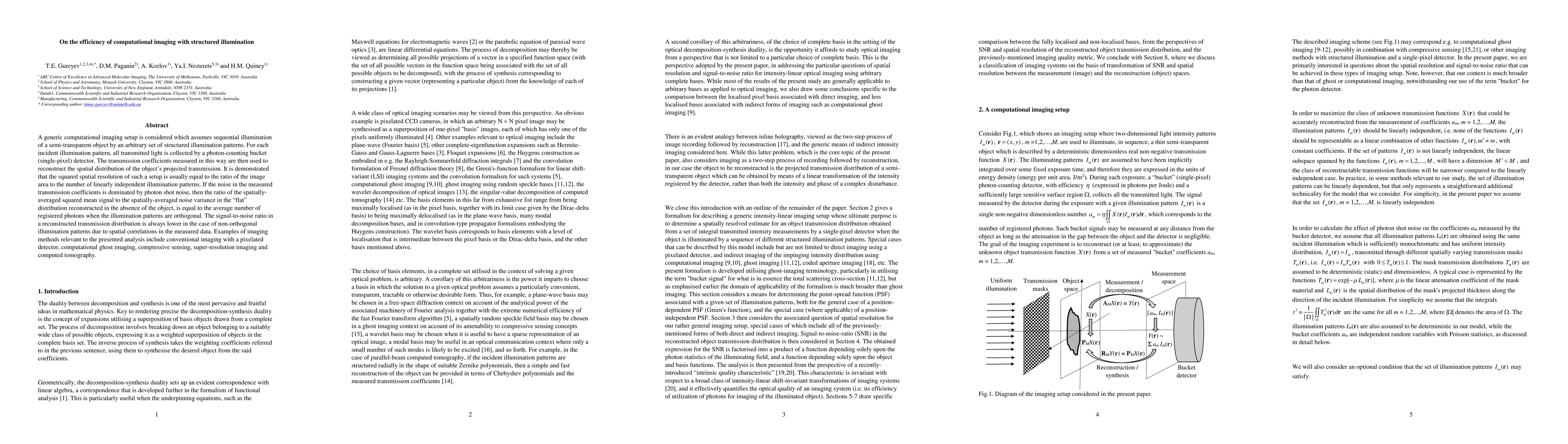 A generic computational imaging setup is considered which assumes sequential illumination of a semi-transparent object by an arbitrary set of structured illumination patterns. For each incident illumination pattern, all transmitted light is collected by a photon-counting bucket (single-pixel) detector. The transmission coefficients measured in this way are then used to reconstruct the spatial distribution of the object's projected transmission. It is demonstrated that the squared spatial resolution of such a setup is usually equal to the ratio of the image area to the number of linearly independent illumination patterns. If the noise in the measured transmission coefficients is dominated by photon shot noise, then the ratio of the spatially-averaged squared mean signal to the spatially-averaged noise variance in the "flat" distribution reconstructed in the absence of the object, is equal to the average number of registered photons when the illumination patterns are orthogonal. The signal-to-noise ratio in a reconstructed transmission distribution is always lower in the case of non-orthogonal illumination patterns due to spatial correlations in the measured data. Examples of imaging methods relevant to the presented analysis include conventional imaging with a pixelated detector, computational ghost imaging, compressive sensing, super-resolution imaging and computed tomography.