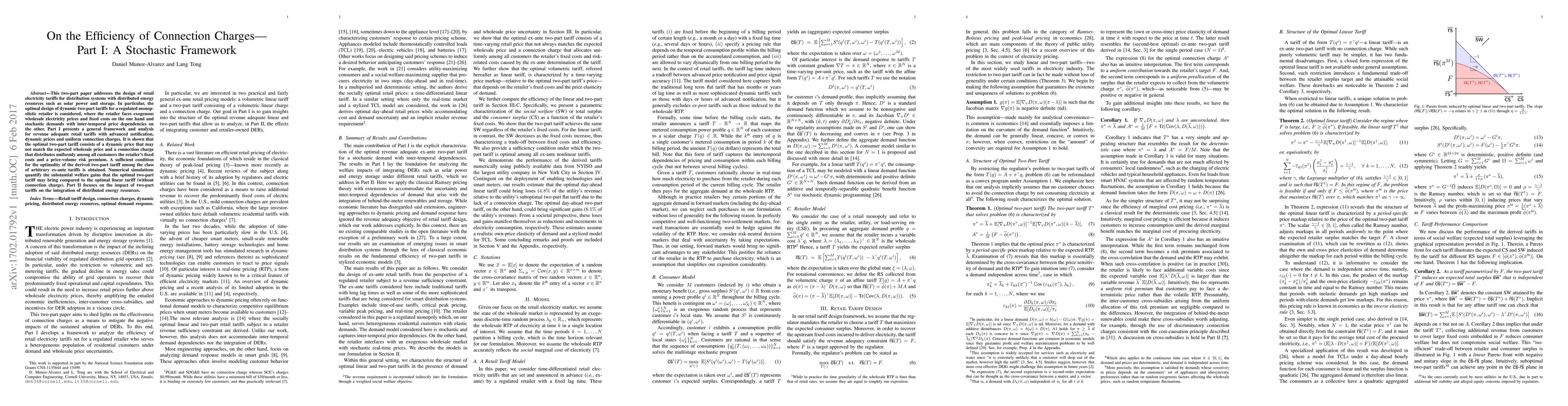 This two-part paper addresses the design of retail electricity tariffs for distribution systems with distributed energy resources such as solar power and storage. In particular, the optimal design of dynamic two-part tariffs for a regulated monopolistic retailer is considered, where the retailer faces exogenous wholesale electricity prices and fixed costs on the one hand and stochastic demands with inter-temporal price dependencies on the other. Part I presents a general framework and analysis for revenue adequate retail tariffs with advanced notification, dynamic prices and uniform connection charges. It is shown that the optimal two-part tariff consists of a dynamic price that may not match the expected wholesale price and a connection charge that distributes uniformly among all customers the retailer's fixed costs and a price-volume risk premium. A sufficient condition for the optimality of the derived two-part tariff among the class of arbitrary ex-ante tariffs is obtained. Numerical simulations quantify the substantial welfare gains that the optimal two-part tariff may bring compared to the optimal linear tariff (without connection charge). Part II focuses on the impact of two-part tariffs on the integration of distributed energy resources.