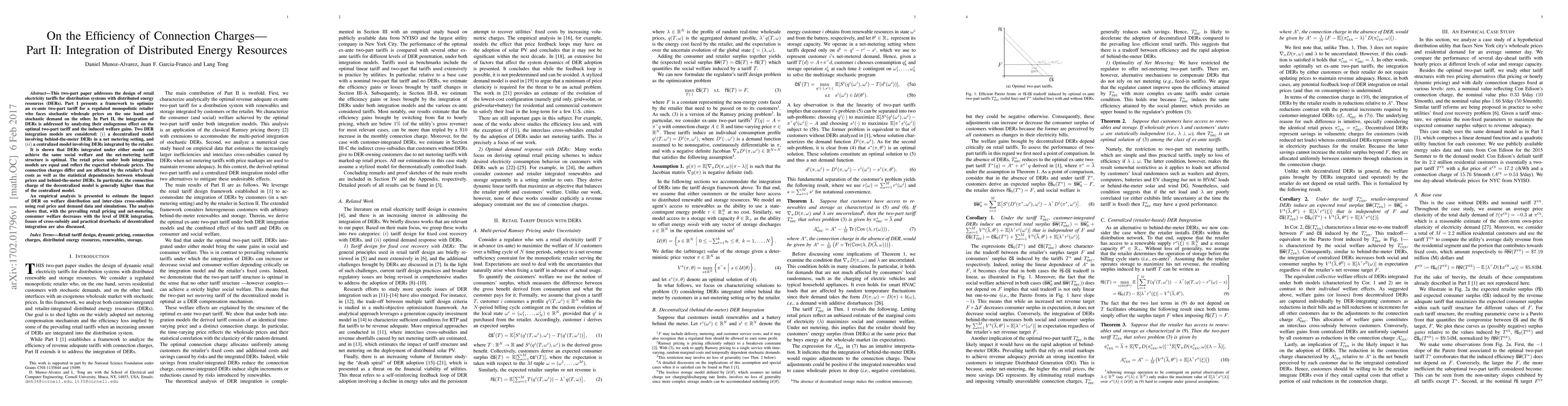 This two-part paper addresses the design of retail electricity tariffs for distribution systems with distributed energy resources (DERs). Part I presents a framework to optimize an ex-ante two-part tariff for a regulated monopolistic retailer who faces stochastic wholesale prices on the one hand and stochastic demand on the other. In Part II, the integration of DERs is addressed by analyzing their endogenous effect on the optimal two-part tariff and the induced welfare gains. Two DER integration models are considered: (i) a decentralized model involving behind-the-meter DERs in a net metering setting, and (ii) a centralized model involving DERs integrated by the retailer. It is shown that DERs integrated under either model can achieve the same social welfare and the net-metering tariff structure is optimal. The retail prices under both integration models are equal and reflect the expected wholesale prices. The connection charges differ and are affected by the retailer's fixed costs as well as the statistical dependencies between wholesale prices and behind-the-meter DERs. In particular, the connection charge of the decentralized model is generally higher than that of the centralized model. An empirical analysis is presented to estimate the impact of DER on welfare distribution and inter-class cross-subsidies using real price and demand data and simulations. The analysis shows that, with the prevailing retail pricing and net-metering, consumer welfare decreases with the level of DER integration. Issues of cross-subsidy and practical drawbacks of decentralized integration are also discussed.