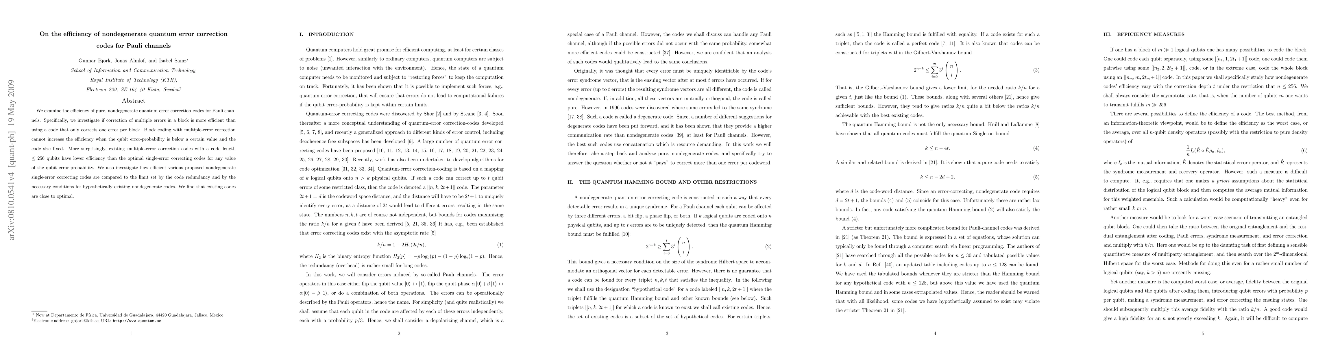 This paper investigates the efficiency of nondegenerate quantum error correction codes for Pauli channels, finding that multiple-error correction codes are not more efficient than single-error codes below a certain error probability threshold. It concludes that existing single-error codes are nearly optimal, even when the code length is up to 256 qubits.