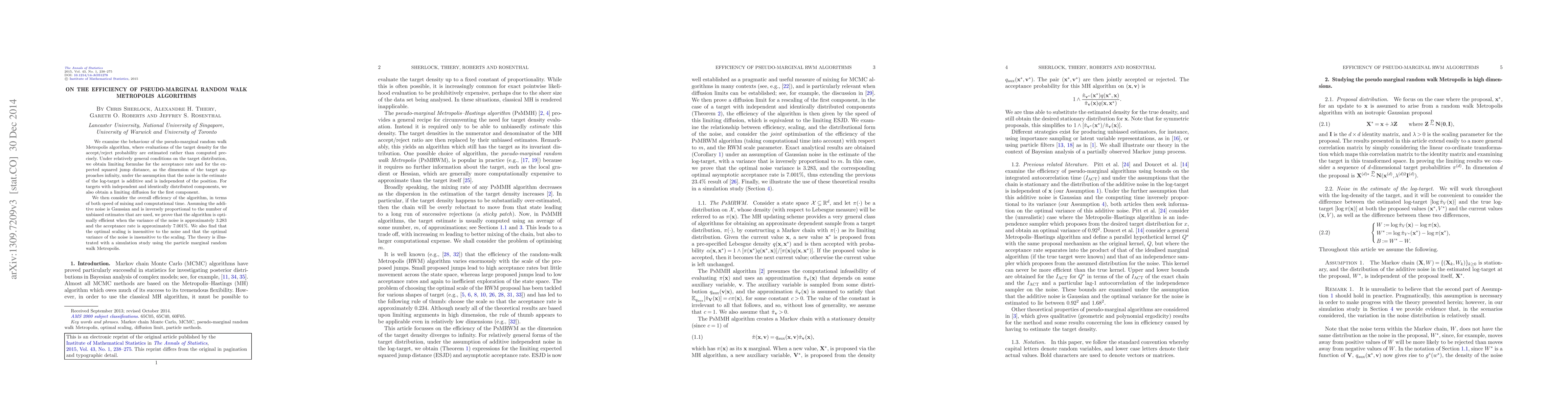 This paper investigates the efficiency of pseudo-marginal random walk Metropolis algorithms, deriving limiting formulae for acceptance rates and jump distances under high-dimensional conditions. It finds optimal efficiency when the noise variance is approximately 3.283 and the acceptance rate is around 7.001%.