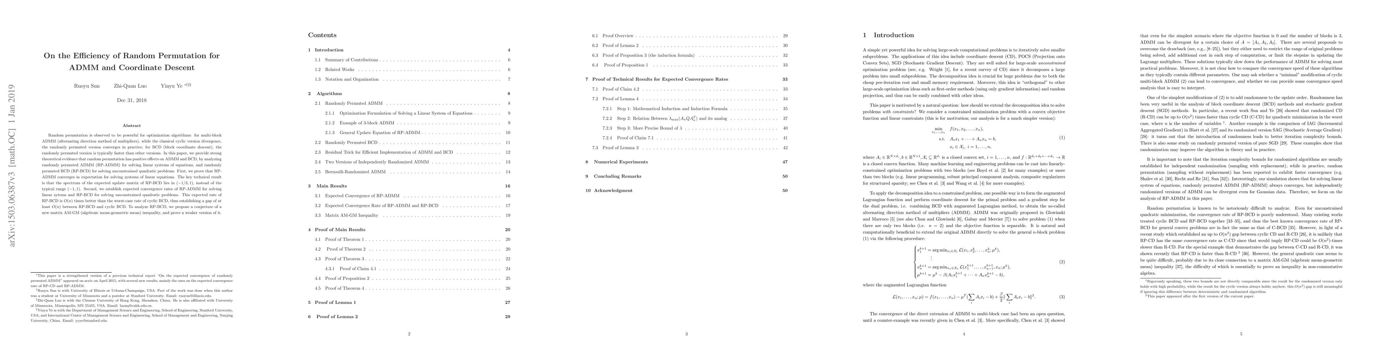 This paper demonstrates that random permutation significantly enhances the efficiency of ADMM and BCD optimization algorithms. It provides theoretical evidence showing that randomly permuted versions of ADMM and BCD converge and outperform their cyclic counterparts, establishing a convergence rate for RP-BCD that is $O(n)$ times better than cyclic BCD.