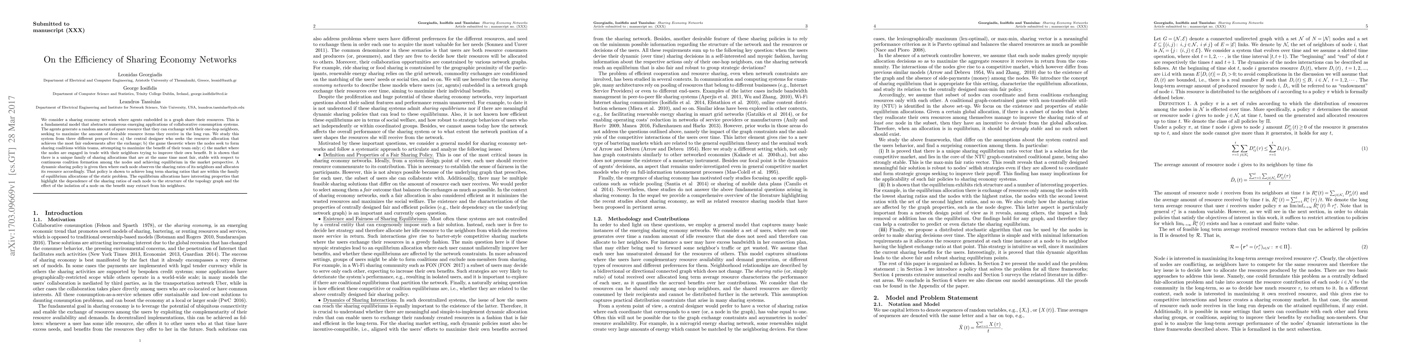 We consider a sharing economy network where agents embedded in a graph share their resources. This is a fundamental model that abstracts numerous emerging applications of collaborative consumption systems. The agents generate a random amount of spare resource that they can exchange with their one-hop neighbours, seeking to maximize the amount of desirable resource items they receive in the long run. We study this system from three different perspectives: a) the central designer who seeks the resource allocation that achieves the most fair endowments after the exchange; b) the game theoretic where the nodes seek to form sharing coalitions within teams, attempting to maximize the benefit of their team only; c) the market where the nodes are engaged in trade with their neighbours trying to improve their own benefit. It is shown that there is a unique family of sharing allocations that are at the same time most fair, stable with respect to continuous coalition formation among the nodes and achieving equilibrium in the market perspective. A dynamic sharing policy is given then where each node observes the sharing rates of its neighbours and allocates its resource accordingly. That policy is shown to achieve long term sharing ratios that are within the family of equilibrium allocations of the static problem. The equilibrium allocations have interesting properties that highlight the dependence of the sharing ratios of each node to the structure of the topology graph and the effect of the isolation of a node on the benefit may extract from his neighbours.
