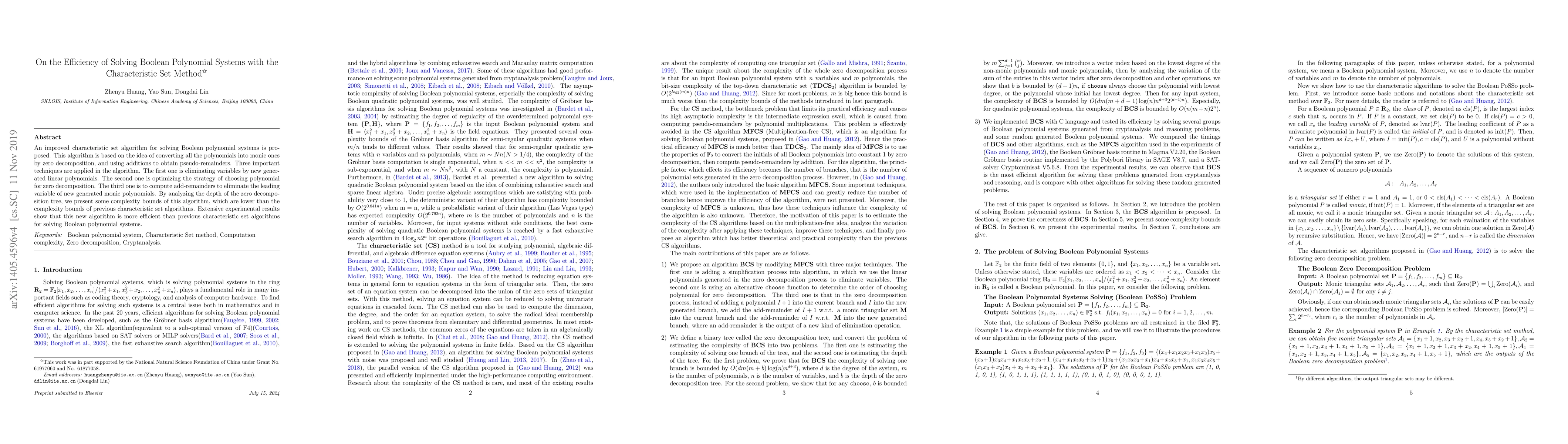 An improved characteristic set algorithm for solving Boolean polynomial systems is proposed. This algorithm is based on the idea of converting all the polynomials into monic ones by zero decomposition, and using additions to obtain pseudo-remainders. Three important techniques are applied in the algorithm. The first one is eliminating variables by new generated linear polynomials. The second one is optimizing the strategy of choosing polynomial for zero decomposition. The third one is to compute add-remainders to eliminate the leading variable of new generated monic polynomials. By analyzing the depth of the zero decomposition tree, we present some complexity bounds of this algorithm, which are lower than the complexity bounds of previous characteristic set algorithms. Extensive experimental results show that this new algorithm is more efficient than previous characteristic set algorithms for solving Boolean polynomial systems.