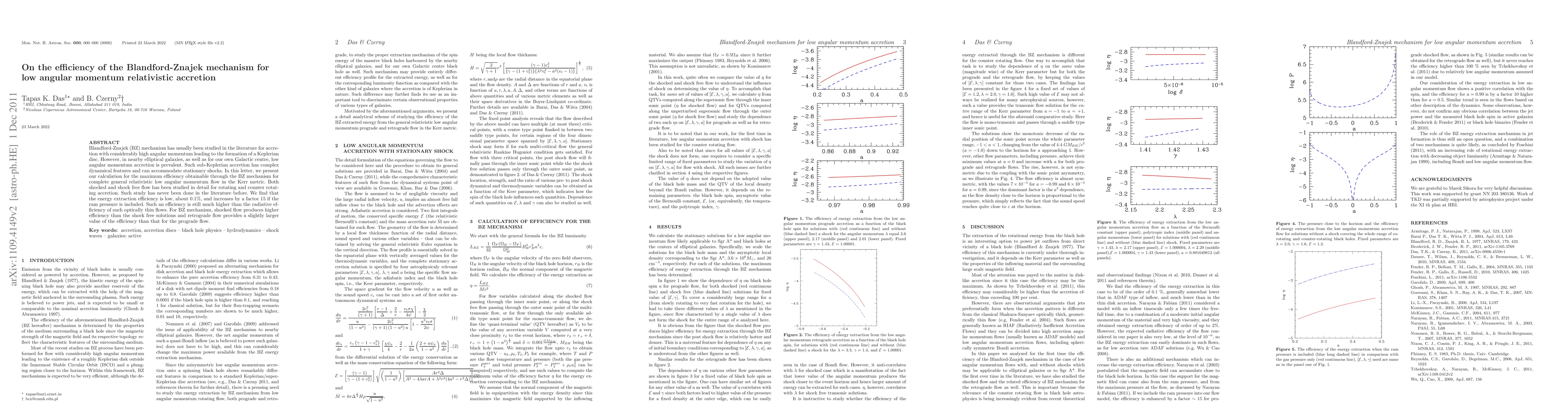 This paper investigates the efficiency of the Blandford-Znajek mechanism for low angular momentum relativistic accretion, finding that it extracts energy at a low efficiency of about 0.1%, which increases to 1.5% when ram pressure is included, and is higher than the radiative efficiency of such flows. Shocked flows show higher efficiency than shock-free ones, and retrograde flows slightly outperform prograde flows.