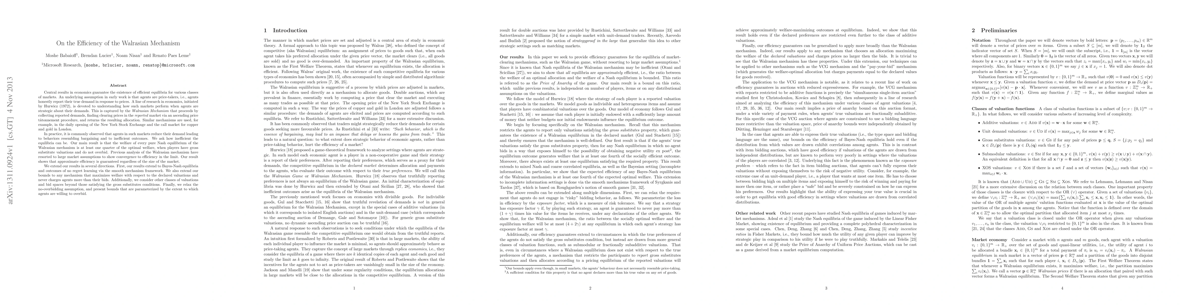 This paper explores the efficiency of the Walrasian mechanism under strategic behavior, demonstrating that pure Nash equilibria yield at least one quarter of the optimal welfare, even without large market assumptions. It addresses inefficiencies arising from agents reducing their demand, showing approximate efficiency regardless of market size.