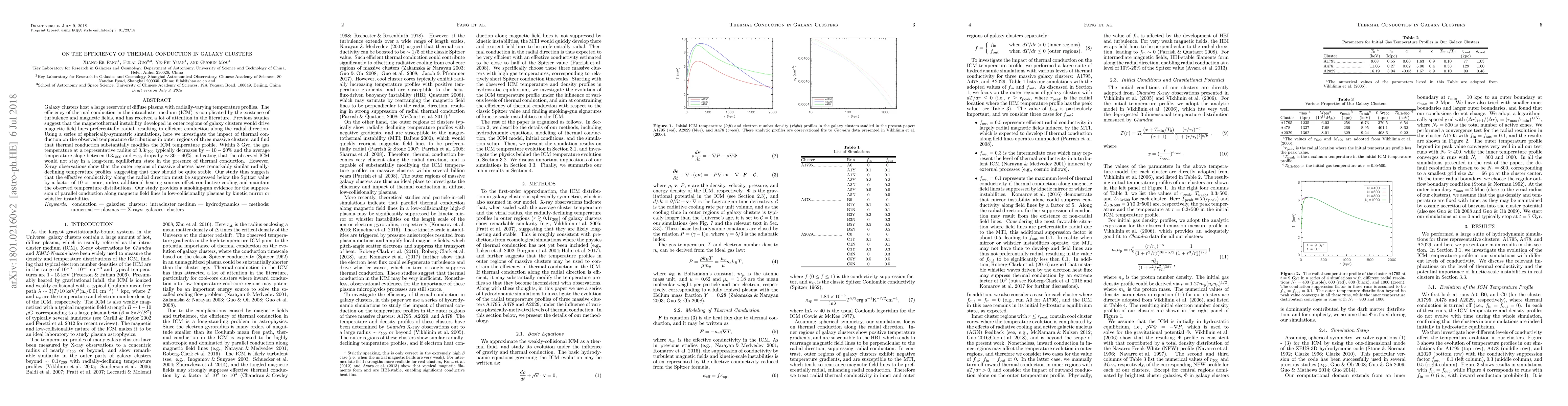 This study investigates the impact of thermal conduction in galaxy clusters' intracluster medium, finding that it significantly alters temperature profiles. The research suggests that effective radial conduction must be much lower than expected to explain the observed stable temperature profiles, indicating suppression by kinetic instabilities.