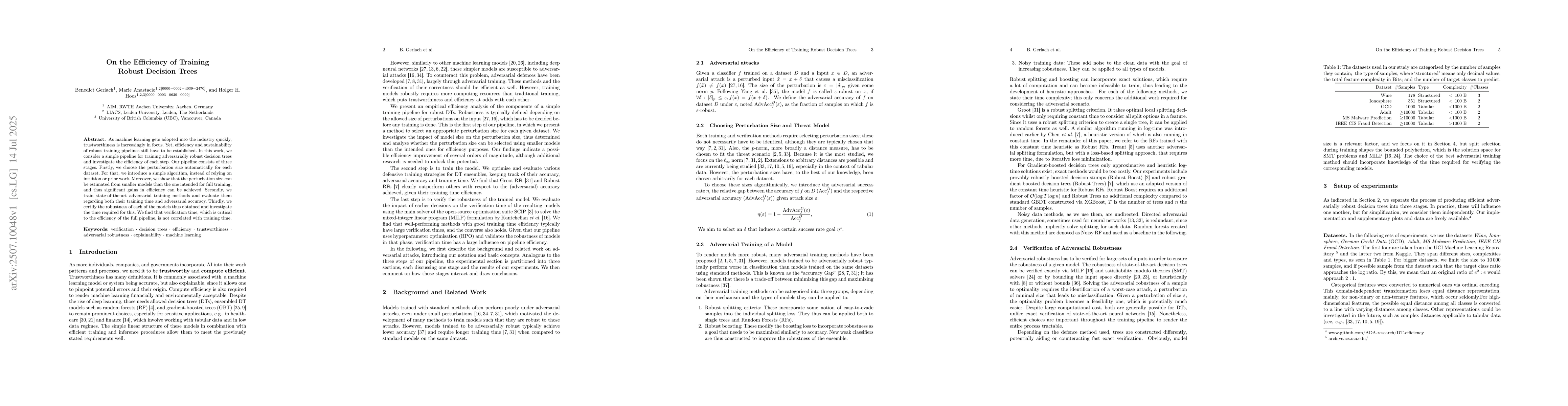 As machine learning gets adopted into the industry quickly, trustworthiness is increasingly in focus. Yet, efficiency and sustainability of robust training pipelines still have to be established. In this work, we consider a simple pipeline for training adversarially robust decision trees and investigate the efficiency of each step. Our pipeline consists of three stages. Firstly, we choose the perturbation size automatically for each dataset. For that, we introduce a simple algorithm, instead of relying on intuition or prior work. Moreover, we show that the perturbation size can be estimated from smaller models than the one intended for full training, and thus significant gains in efficiency can be achieved. Secondly, we train state-of-the-art adversarial training methods and evaluate them regarding both their training time and adversarial accuracy. Thirdly, we certify the robustness of each of the models thus obtained and investigate the time required for this. We find that verification time, which is critical to the efficiency of the full pipeline, is not correlated with training time.