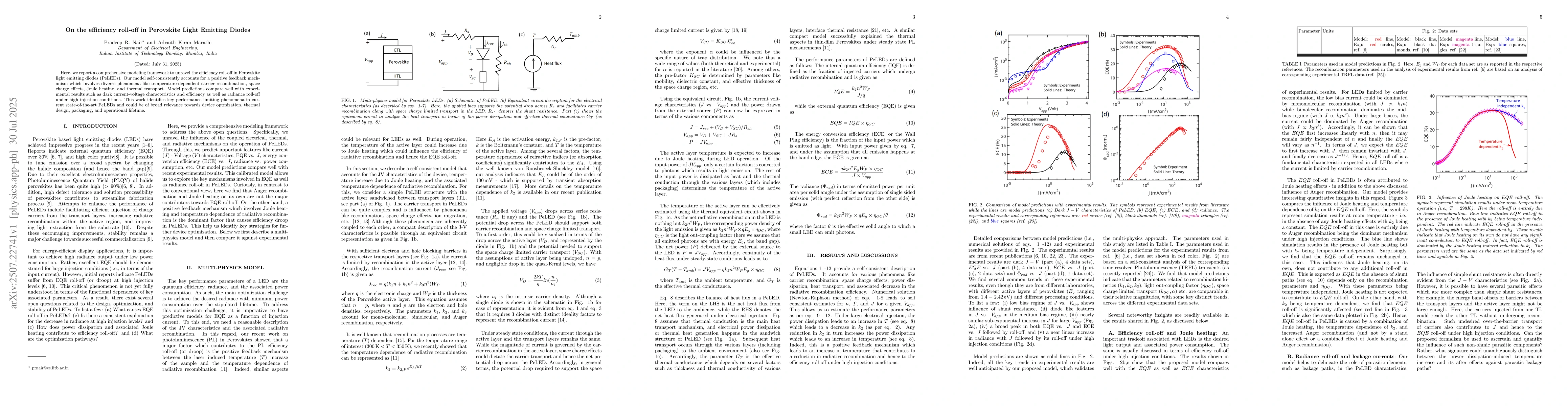 The research presents a comprehensive modeling framework for Perovskite Light Emitting Diodes (PeLEDs) that accounts for diverse phenomena like temperature-dependent carrier recombination, space charge effects, Joule heating, and thermal transport.