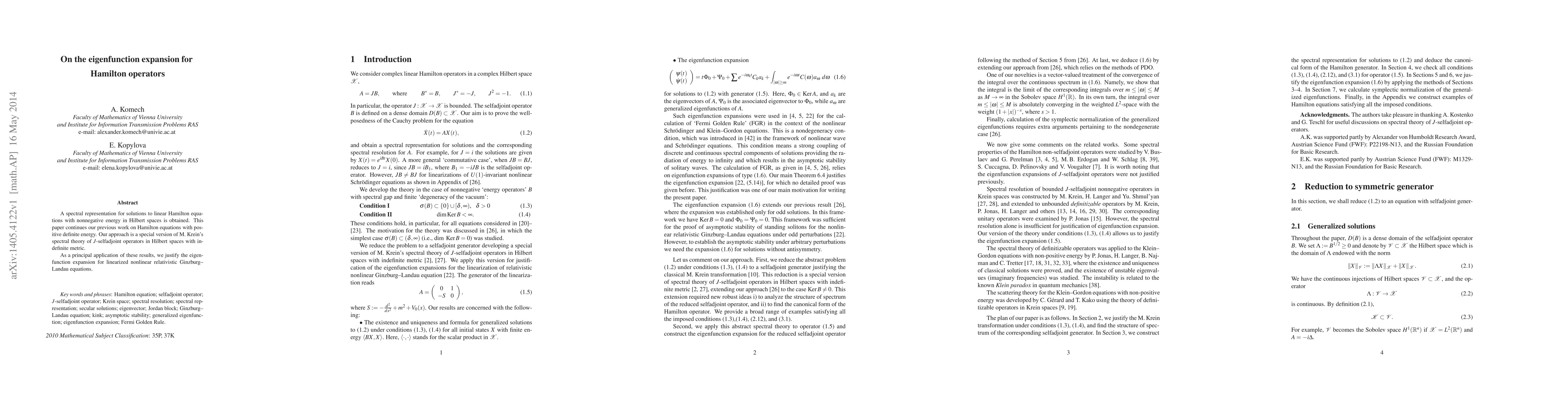 This paper develops a spectral representation for solutions to linear Hamilton equations with nonnegative energy using M. Krein's spectral theory of $J$-selfadjoint operators. It extends previous work on positive definite energy and applies the results to justify the eigenfunction expansion for linearized nonlinear relativistic Ginzburg-Landau equations.