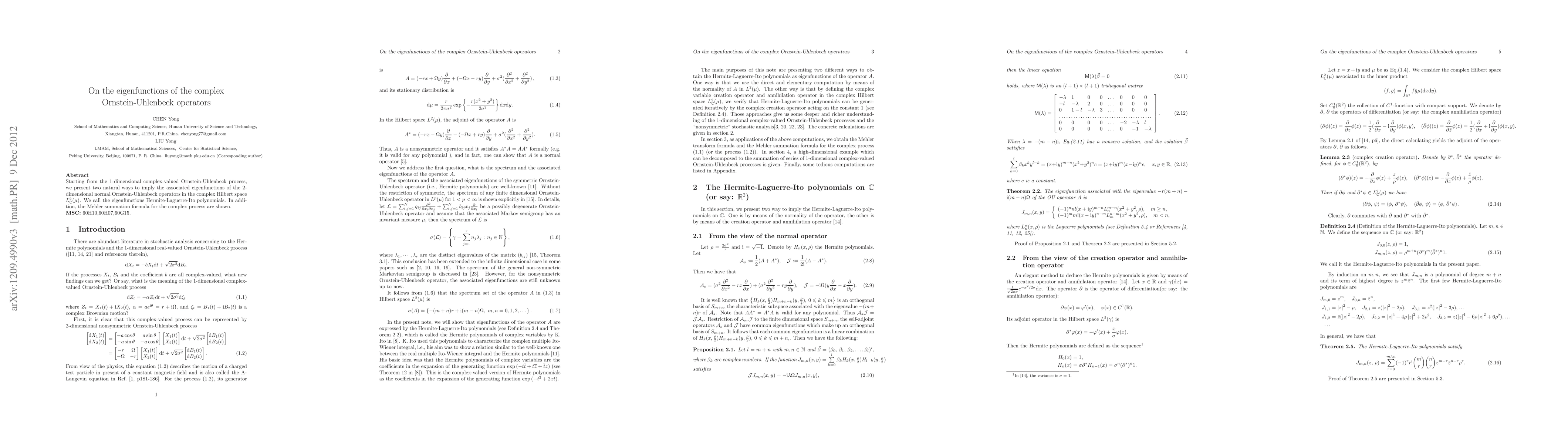 This paper explores the eigenfunctions of 2-dimensional normal Ornstein-Uhlenbeck operators derived from a 1-dimensional complex-valued process, introducing them as Hermite-Laguerre-Ito polynomials. It also presents the Mehler summation formula for the complex process.