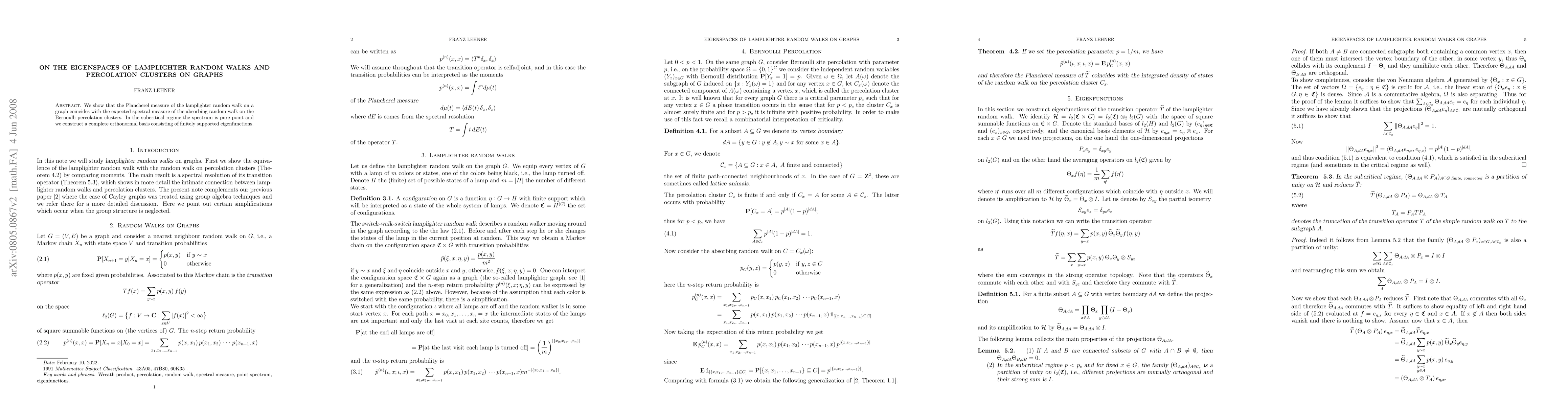 The paper shows that the Plancherel measure of a lamplighter random walk on graphs matches the expected spectral measure of percolation clusters, leading to a pure point spectrum in the subcritical regime.