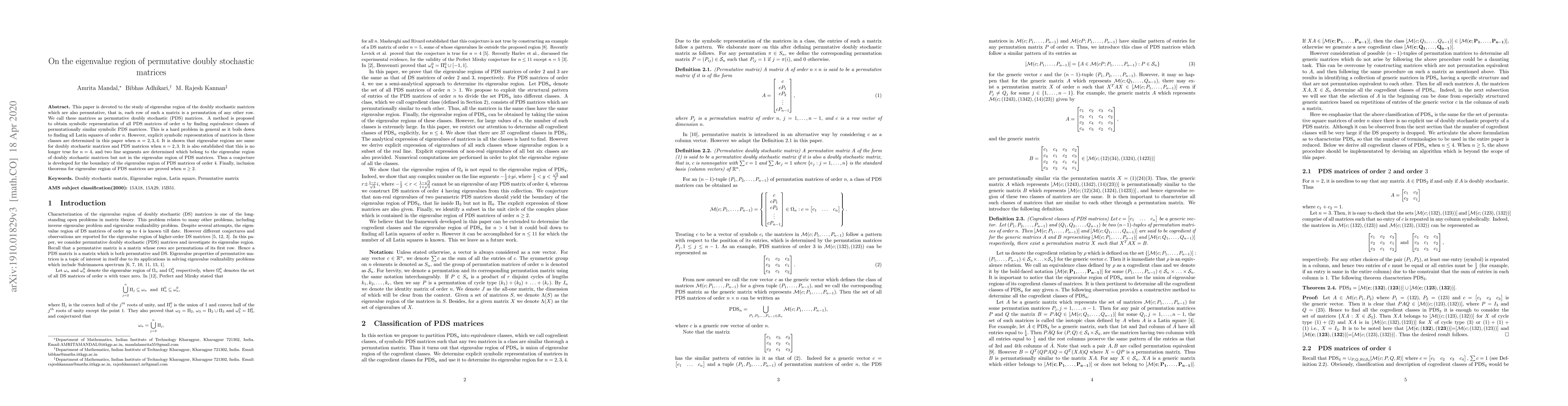 This paper investigates the eigenvalue region of permutative doubly stochastic matrices (PDS), proposing a method to find symbolic representations of PDS matrices of orders 2, 3, and 4. It reveals that while eigenvalue regions are identical for doubly stochastic and PDS matrices for orders 2 and 3, they diverge for order 4, leading to a conjecture for the boundary of PDS eigenvalue regions.