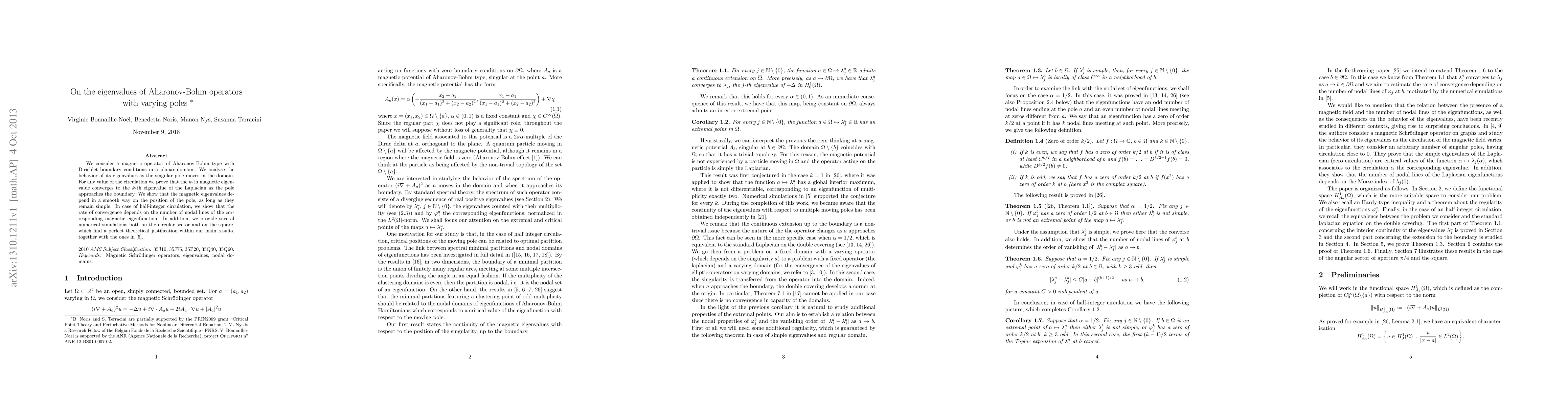 This paper studies the eigenvalues of Aharonov-Bohm operators with a moving pole in a planar domain, proving that they converge smoothly to Laplacian eigenvalues as the pole approaches the boundary. The convergence rate is shown to depend on the number of nodal lines when the circulation is half-integer, supported by numerical simulations.