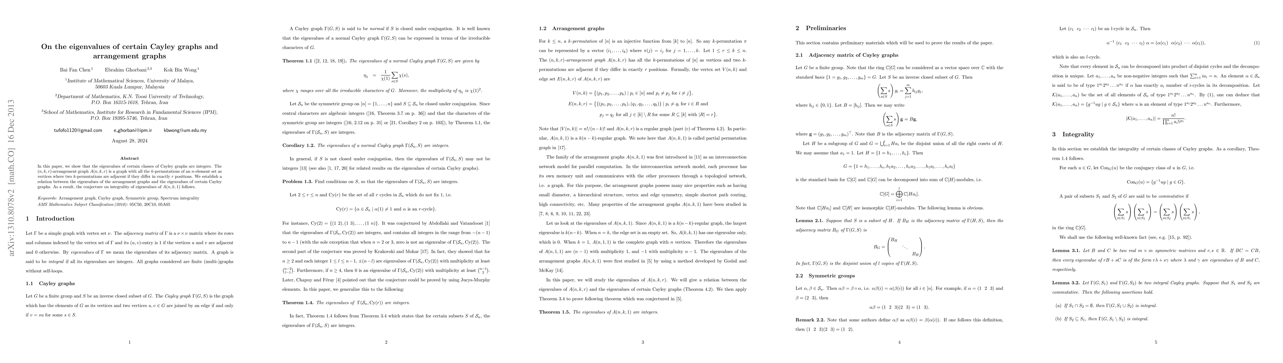 In this paper, we show that the eigenvalues of certain classes of Cayley graphs are integers. The (n,k,r)-arrangement graph A(n,k,r) is a graph with all the k-permutations of an n-element set as vertices where two k-permutations are adjacent if they differ in exactly r positions. We establish a relation between the eigenvalues of the arrangement graphs and the eigenvalues of certain Cayley graphs. As a result, the conjecture on integrality of eigenvalues of A(n,k,1) follows.
