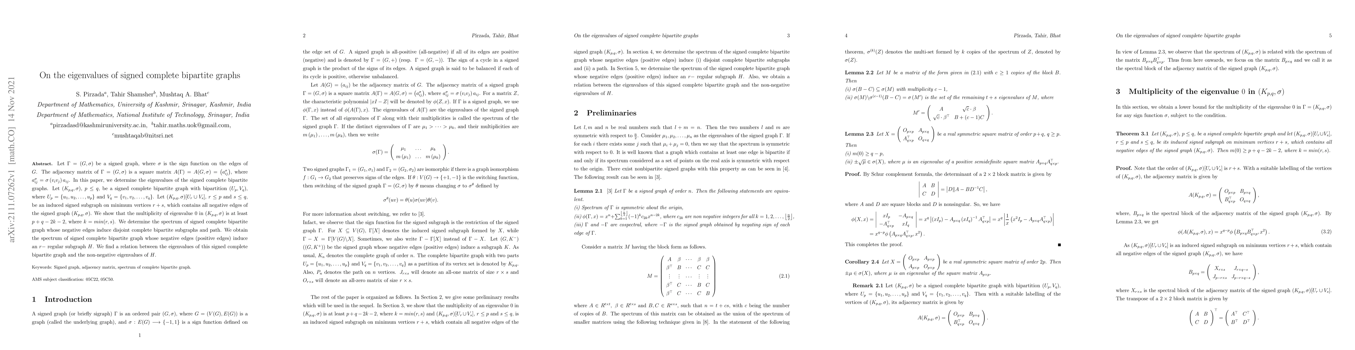This paper investigates the eigenvalues of signed complete bipartite graphs, determining the spectrum for various configurations including those with negative edges inducing disjoint complete bipartite subgraphs and paths. It establishes a relationship between the eigenvalues of the signed graph and the non-negative eigenvalues of induced subgraphs.