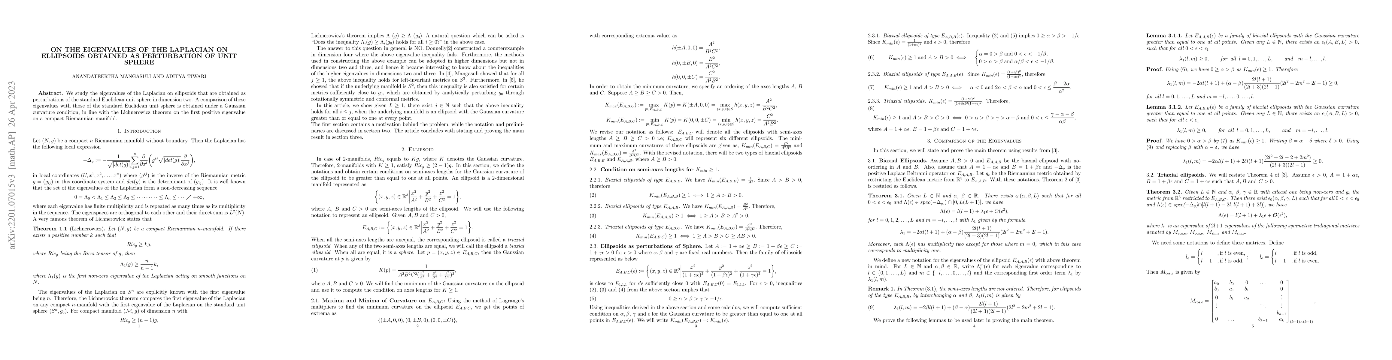 This paper investigates the eigenvalues of the Laplacian on ellipsoids formed by perturbing a unit sphere, comparing them to those of the unit sphere under a Gaussian curvature condition. The study aligns with the Lichnerowicz theorem for the first positive eigenvalue on compact Riemannian manifolds.