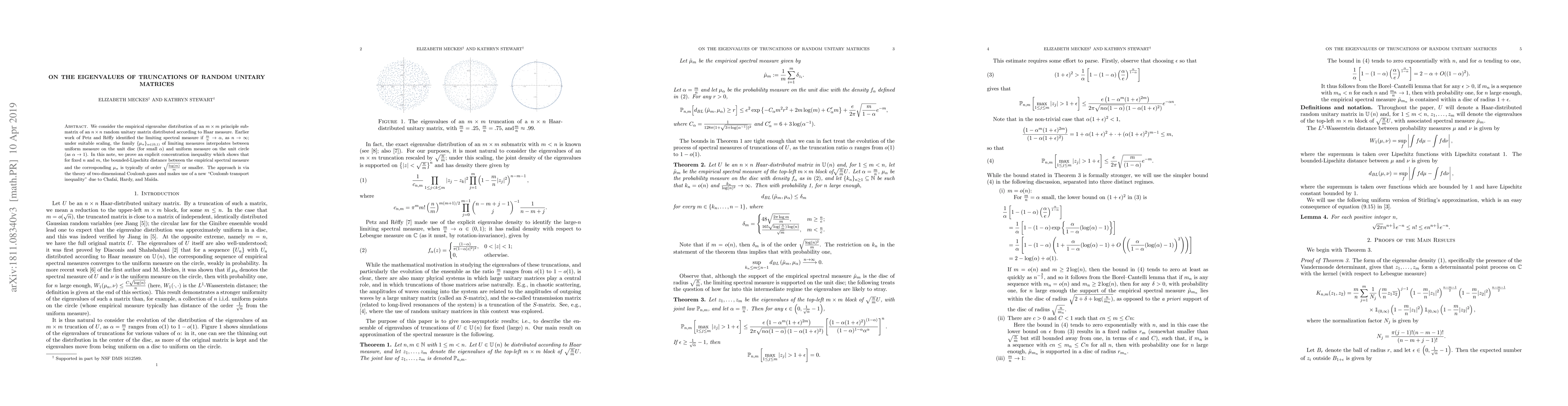 This paper investigates the eigenvalue distribution of truncated random unitary matrices, proving a concentration inequality that shows the empirical spectral measure closely approximates the limiting measure $\mu_\alpha$ for fixed $n$ and $m$. The result leverages the theory of two-dimensional Coulomb gases and a new "Coulomb transport inequality."