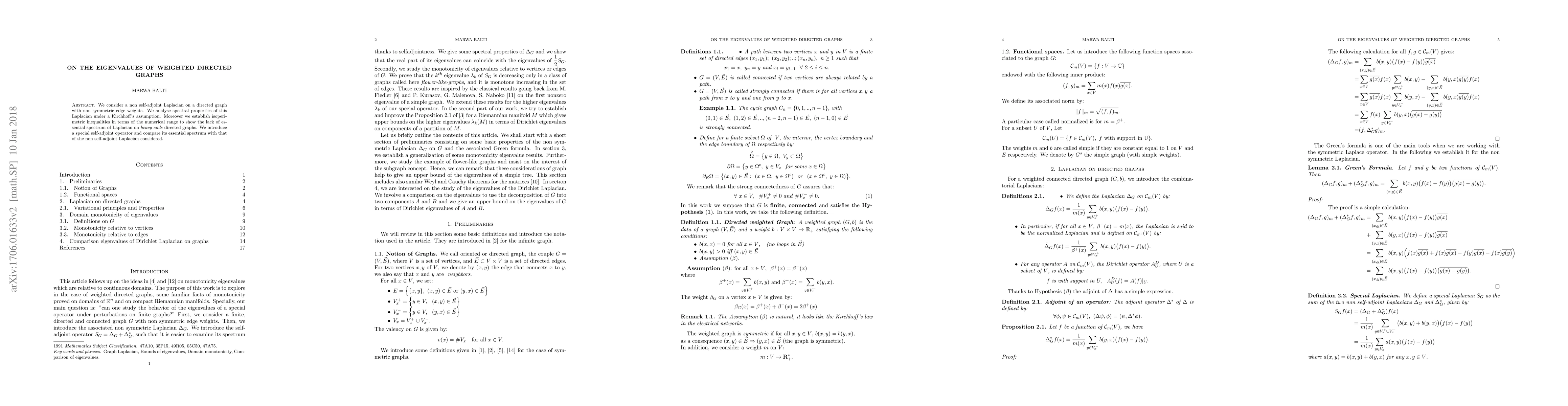 This paper explores the spectral properties of weighted directed graphs, focusing on monotonicity and eigenvalue comparisons. It introduces a self-adjoint operator derived from two non-self-adjoint Laplacians and examines how graph perturbations affect eigenvalues, leveraging matrix analysis techniques.