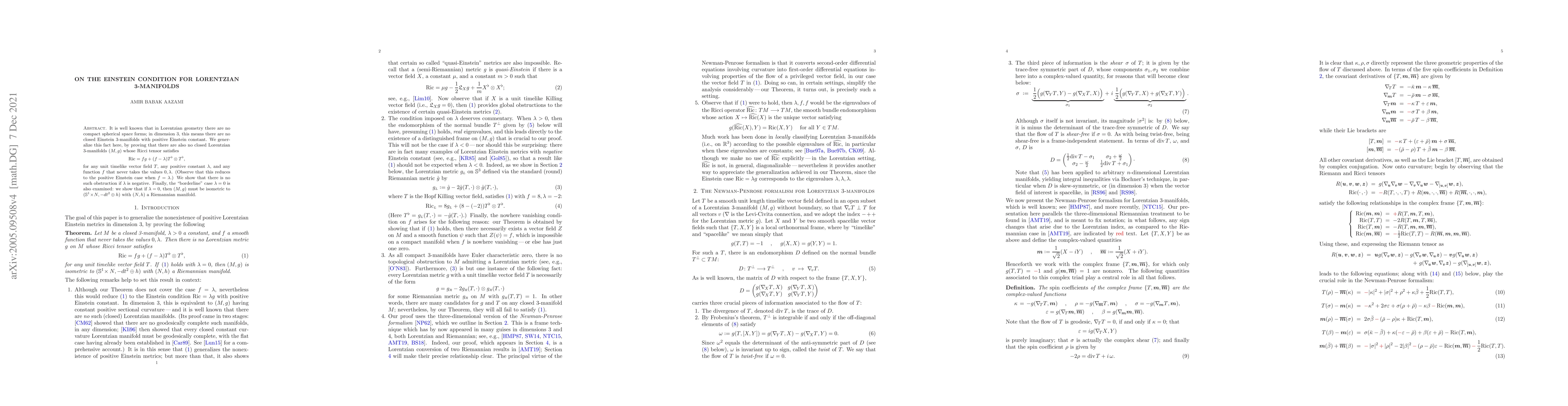 It is well known that in Lorentzian geometry there are no compact spherical space forms; in dimension 3, this means there are no closed Einstein 3-manifolds with positive Einstein constant. We generalize this fact here, by proving that there are also no closed Lorentzian 3-manifolds $(M,g)$ whose Ricci tensor satisfies $$ \text{Ric} = fg+(f-\lambda)T^{\flat}\otimes T^{\flat}, $$ for any unit timelike vector field $T$, any positive constant $\lambda$, and any smooth function $f$ that never takes the values $0,\lambda$. (Observe that this reduces to the positive Einstein case when $f = \lambda$.) We show that there is no such obstruction if $\lambda$ is negative. Finally, the "borderline" case $\lambda = 0$ is also examined: we show that if $\lambda = 0$ and $f > 0$, then $(M,g)$ must be isometric to $(\mathbb{S}^1\!\times \!N,-dt^2\oplus h)$ with $(N,h)$ a Riemannian manifold.