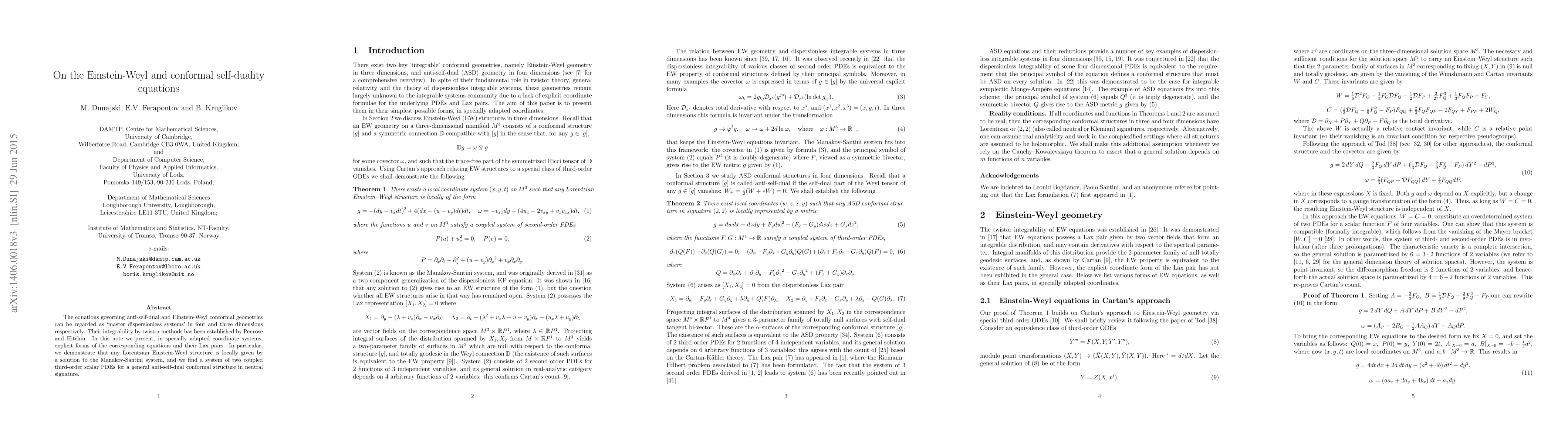 The equations governing anti-self-dual and Einstein-Weyl conformal geometries can be regarded as `master dispersionless systems' in four and three dimensions respectively. Their integrability by twistor methods has been established by Penrose and Hitchin. In this note we present, in specially adapted coordinate systems, explicit forms of the corresponding equations and their Lax pairs. In particular, we demonstrate that any Lorentzian Einstein-Weyl structure is locally given by a solution to the Manakov-Santini system, and we find a system of two coupled third-order scalar PDEs for a general anti-self-dual conformal structure in neutral signature.