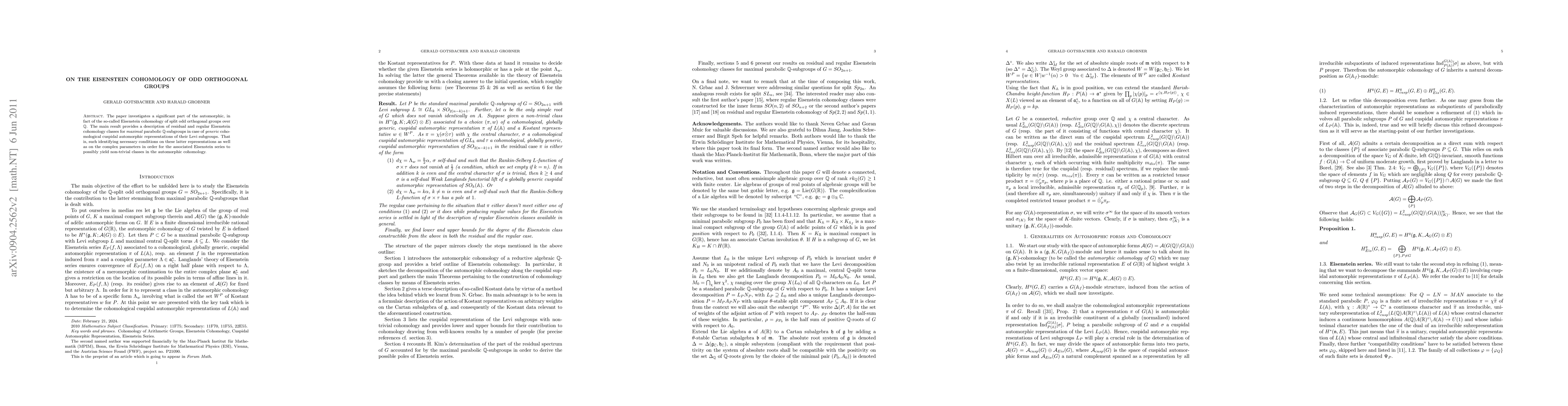 The paper explores Eisenstein cohomology for split odd orthogonal groups over Q, focusing on identifying conditions for non-trivial classes in the automorphic cohomology associated with generic cuspidal representations of their Levi subgroups. The main result delineates necessary conditions for these representations and parameters.