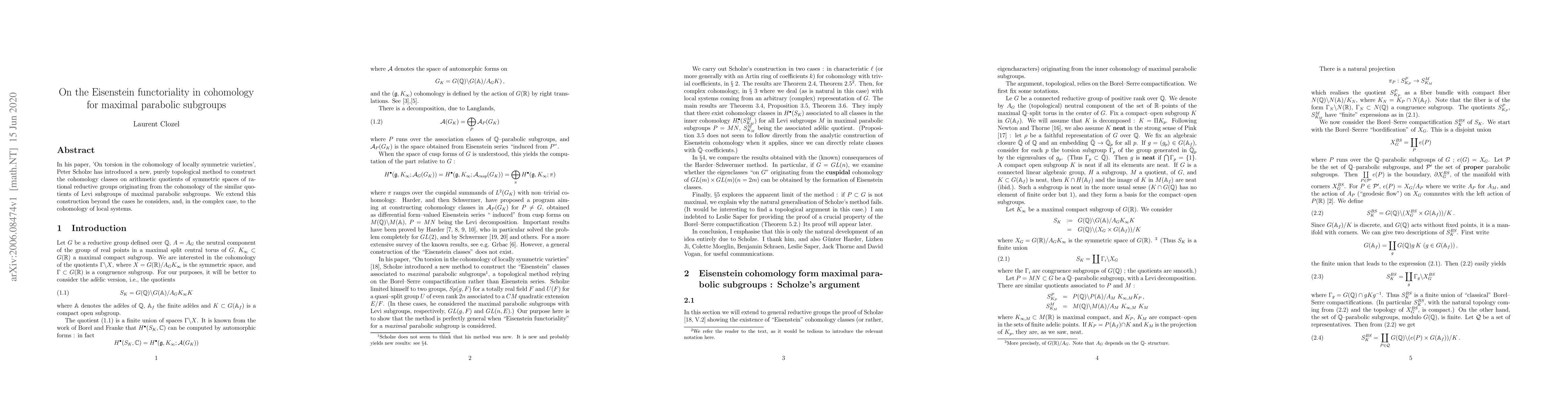 Summary: This paper extends Peter Scholze's topological method for constructing cohomology classes on arithmetic quotients from Levi subgroups of maximal parabolic subgroups to broader cases, including the cohomology of local systems in the complex case.