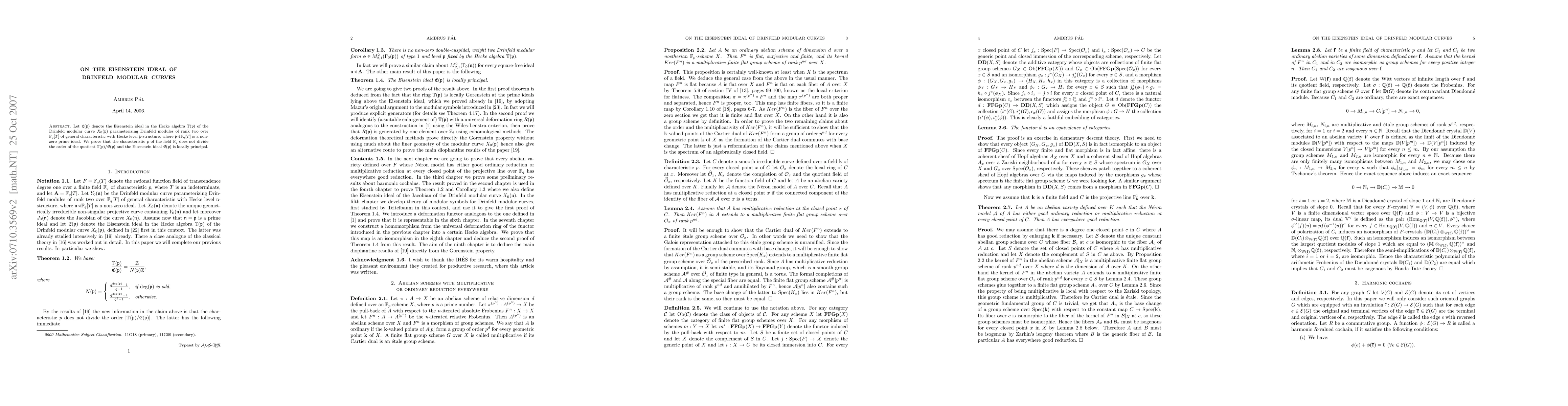 This paper investigates the Eisenstein ideal $\goth E(\goth p)$ in the Hecke algebra $\Bbb T(\goth p)$ associated with Drinfeld modular curves, proving that the characteristic $p$ does not divide the order of $\Bbb T(\goth p)/\goth E(\goth p)$ and that $\goth E(\goth p)$ is locally principal.