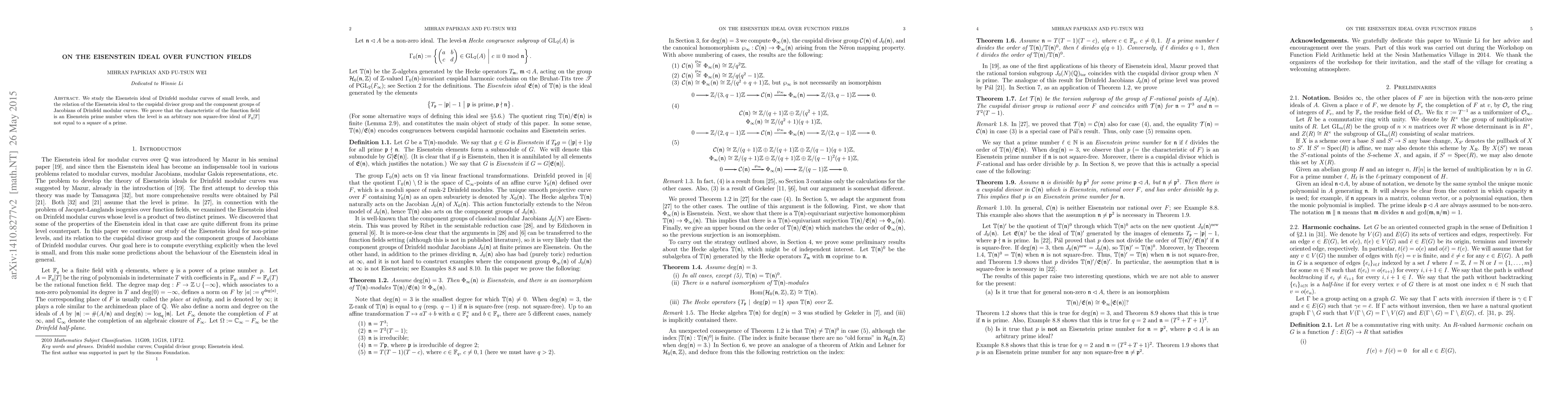 Summary: This paper investigates the Eisenstein ideal in Drinfeld modular curves of small levels, establishing a connection to cuspidal divisors and Jacobian component groups. It proves that the characteristic of the function field is an Eisenstein prime under certain ideal conditions.