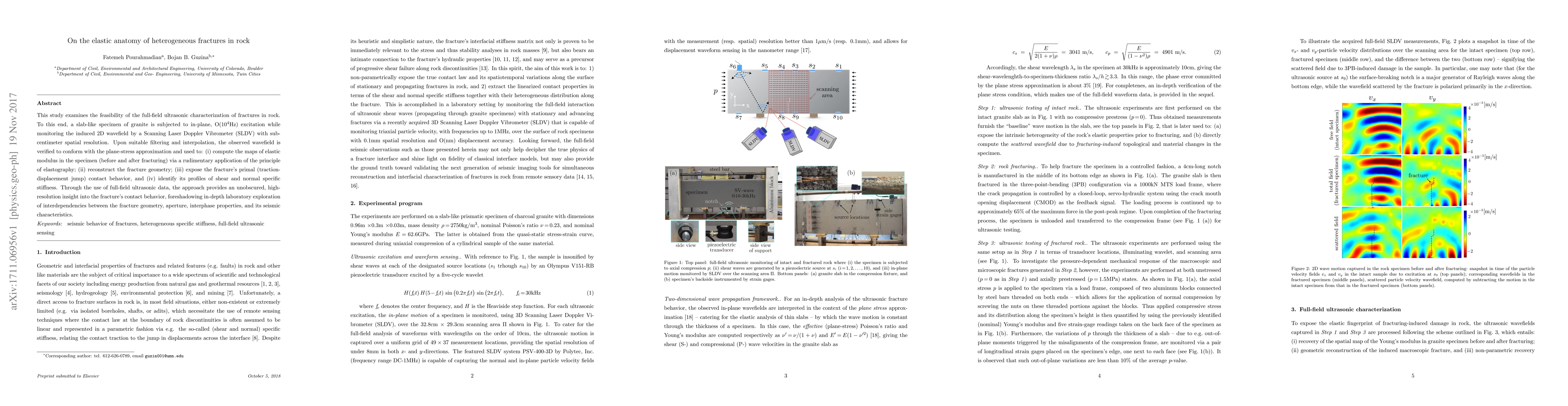 This study examines the feasibility of the full-field ultrasonic characterization of fractures in rock. To this end, a slab-like specimen of granite is subjected to in-plane, O(10$^4$Hz) excitation while monitoring the induced 2D wavefield by a Scanning Laser Doppler Vibrometer (SLDV) with sub-centimeter spatial resolution. Upon suitable filtering and interpolation, the observed wavefield is verified to conform with the plane-stress approximation and used to: (i) compute the maps of elastic modulus in the specimen (before and after fracturing) via a rudimentary application of the principle of elastography; (ii) reconstruct the fracture geometry; (iii) expose the fracture's primal (traction-displacement jump) contact behavior, and (iv) identify its profiles of shear and normal specific stiffness. Through the use of full-field ultrasonic data, the approach provides an unobscured, high-resolution insight into the fracture's contact behavior, foreshadowing in-depth laboratory exploration of interdependencies between the fracture geometry, aperture, interphase properties, and its seismic characteristics.