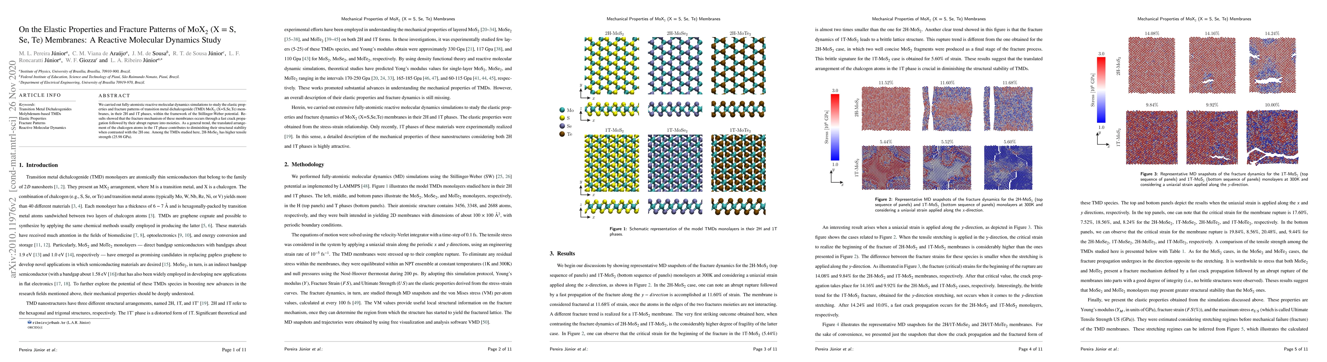 This study uses reactive molecular dynamics simulations to investigate the elastic properties and fracture patterns of MoX2 (X=S, Se, Te) membranes in 2H and 1T phases. The findings indicate that fracture occurs via rapid crack propagation leading to abrupt rupture, with 2H-MoSe2 exhibiting the highest tensile strength of 25.98 GPa.