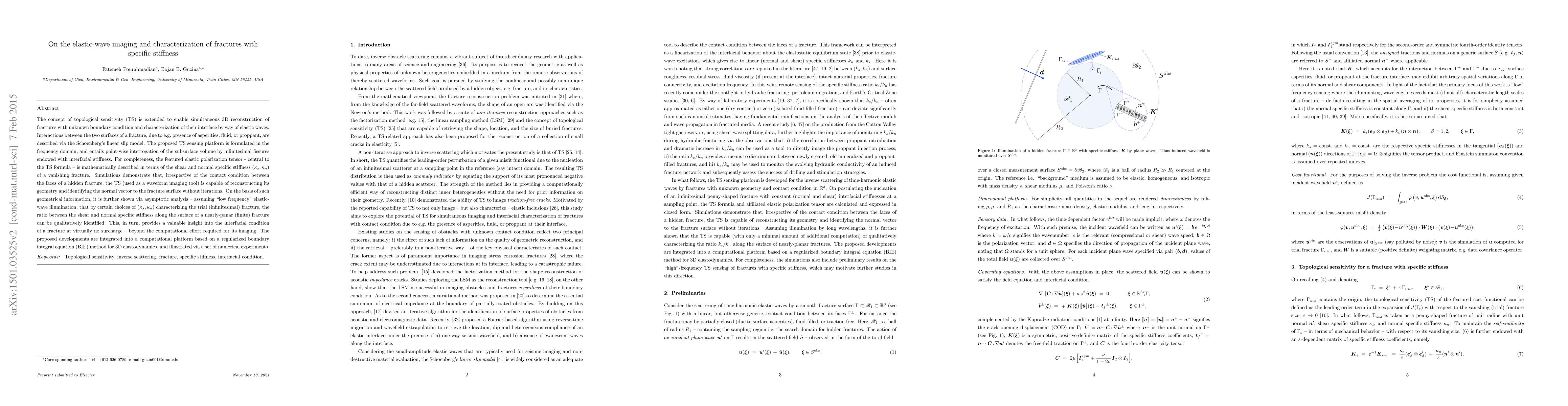 The concept of topological sensitivity (TS) is extended to enable simultaneous 3D reconstruction of fractures with unknown boundary condition and characterization of their interface by way of elastic waves. Interactions between the two surfaces of a fracture, due to e.g. presence of asperities, fluid, or proppant, are described via the Schoenberg's linear slip model. The proposed TS sensing platform is formulated in the frequency domain, and entails point-wise interrogation of the subsurface volume by infinitesimal fissures endowed with interfacial stiffness. For completeness, the featured elastic polarization tensor - central to the TS formula - is mathematically described in terms of the shear and normal specific stiffness (ks,kn) of a vanishing fracture. Simulations demonstrate that, irrespective of the contact condition between the faces of a hidden fracture, the TS (used as a waveform imaging tool) is capable of reconstructing its geometry and identifying the normal vector to the fracture surface without iterations. On the basis of such geometrical information, it is further shown via asymptotic analysis -- assuming "low frequency" elastic-wave illumination, that by certain choices of (ks,kn) characterizing the trial (infinitesimal) fracture, the ratio between the shear and normal specific stiffness along the surface of a nearly-panar (finite) fracture can be qualitatively identified. This, in turn, provides a valuable insight into the interfacial condition of a fracture at virtually no surcharge -- beyond the computational effort required for its imaging. The proposed developments are integrated into a computational platform based on a regularized boundary integral equation (BIE) method for 3D elastodynamics, and illustrated via a set of numerical experiments.