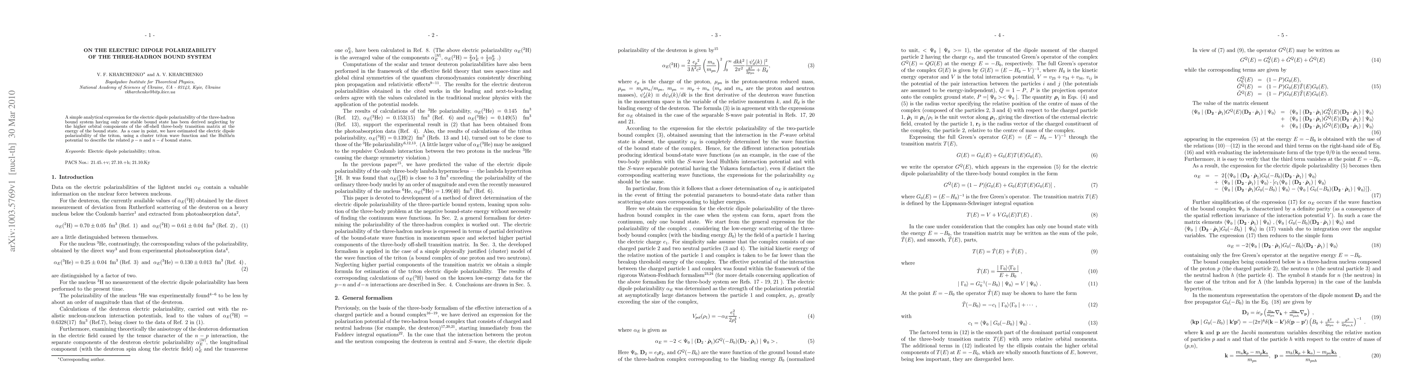 This paper derives an analytical expression for the electric dipole polarizability of a three-hadron bound system with one stable state, focusing on the triton. It estimates this polarizability using a cluster triton wave function and the Hulthen potential for p-n and n-d interactions.