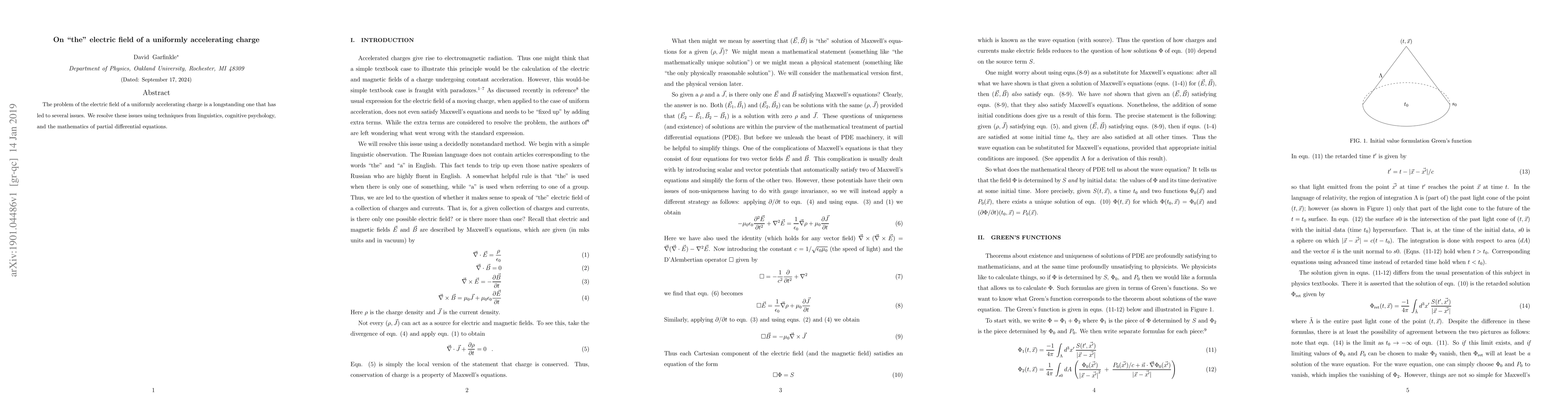 Summary: This paper resolves longstanding issues regarding the electric field of a uniformly accelerating charge, employing interdisciplinary methods from linguistics, cognitive psychology, and the mathematics of partial differential equations. The findings offer a novel understanding of the problem.