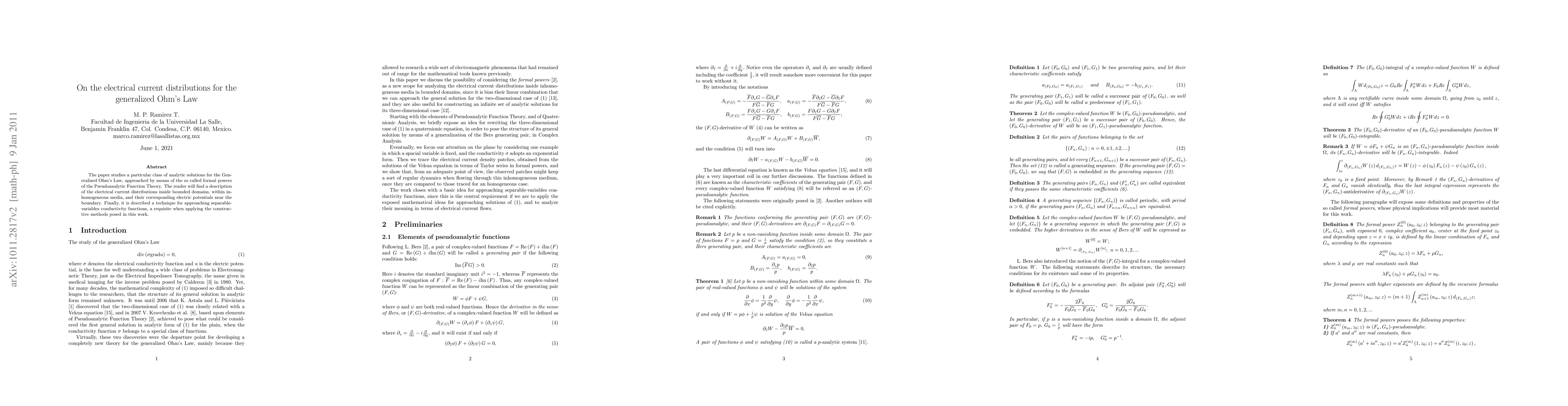 This paper explores analytic solutions for the Generalized Ohm's Law using Pseudoanalytic Function Theory, detailing electrical current distributions in inhomogeneous media and corresponding electric potentials near boundaries. It also introduces a method for handling separable-variables conductivity functions.